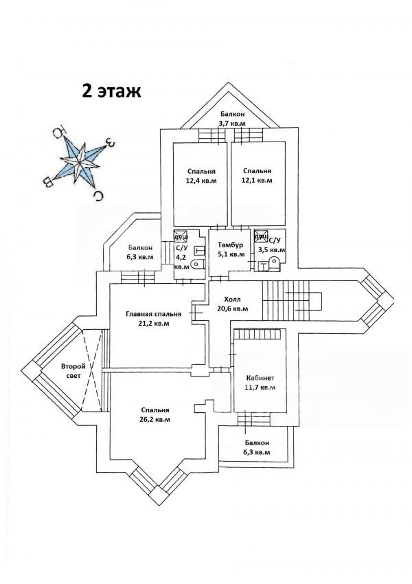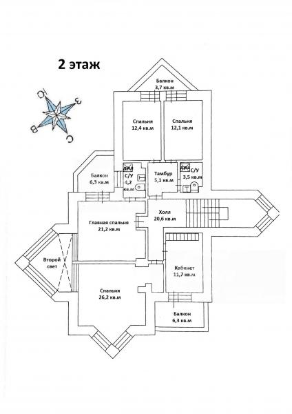 2-ой этаж: холл 21 кв.м, хозяйская спальня 21 кв.м с балконом и с/узлом, две спальни по 12 кв.м с с/узлами и балконом, жилая комната с эркером 26 кв.м, кабинет с балконом