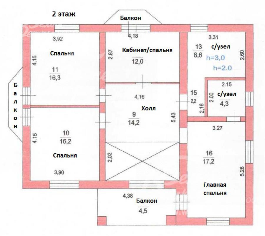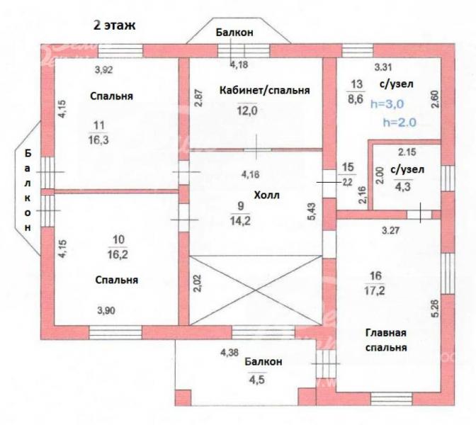 2-ой этаж: холл 14 кв.м, Главная спальня 17 кв.м с с/узлом 4 кв.м и балконом, кабинет/спальня 12 кв.м с балконом, с/узел 8.6 кв.м, две спальни по 16 кв.м с выходами на общий балкон