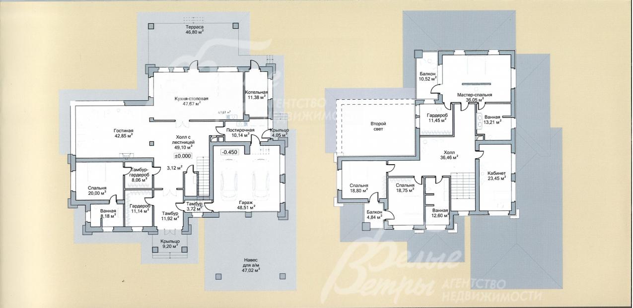 2-ой этаж: холл 36.5 кв.м со вторым светом, спальня хозяев 36 кв.м с ванной комнатой 13 кв.м, гардеробной 11.5 кв.м и выходом на балкон 10.5 кв.м, спальня 18.8 кв.м с ванной комнатой 12.6 кв.м и выходом на балкон 5 кв.м, спальня 18.8 кв.м, кабинет 23.5 кв.м