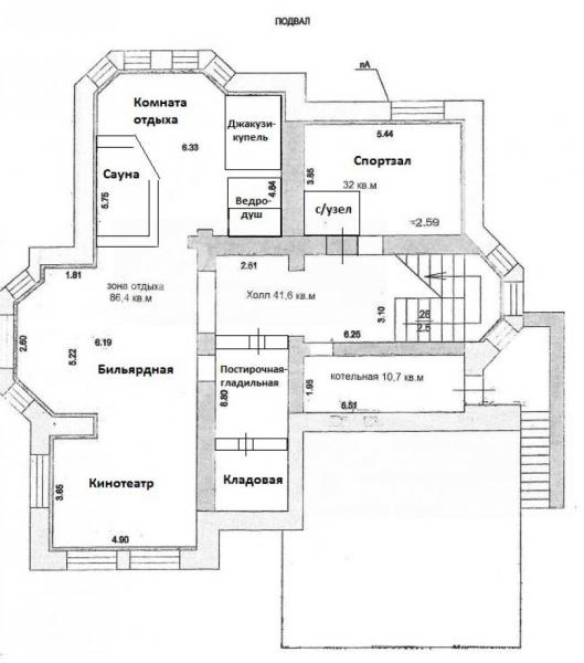 Цоколь: холл 20 кв.м, зона отдыха 86.5 кв.м - бильярдная и кинотеатр, комната отдыха с сауной, купелью-джакузи и душевой, спортзал 30 кв.м, с/узел, котельная 11 кв.м с отдельным выходом, постирочная/гладильная, кладовая