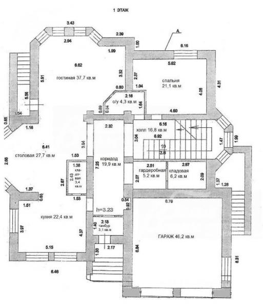 1-ый этаж: Гараж на 2 а/м 46 кв.м, прихожая, холл 20 кв.м, гардеробная 5 кв.м, кладовая 6 кв.м, с/узел, столовая 28 кв.м, кухня 22 кв.м с кладовой, гостиная 38 кв.м с выходом в сад, спальня 21 кв.м.