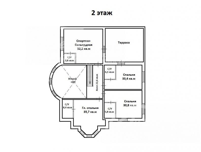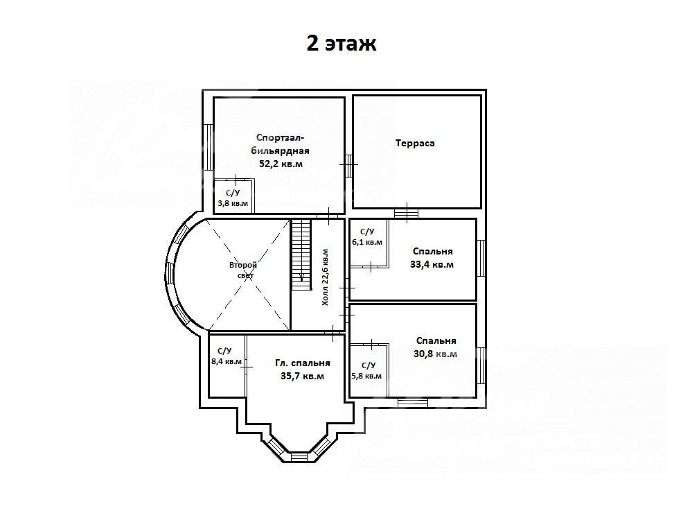 2-ой этаж: Холл- галерея 22.6 кв.м, спальня 33.4 кв.м с с/узлом 6 кв.м, спальня 31 кв.м с с/узлом 6 кв.м, главная спальня 35.7 кв.м с с/узлом 8 кв.м, спортзал-бильярдная 52 кв.м с с/узлом 4 кв.м и с выходом на террасу 40 кв.м.