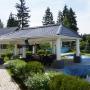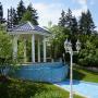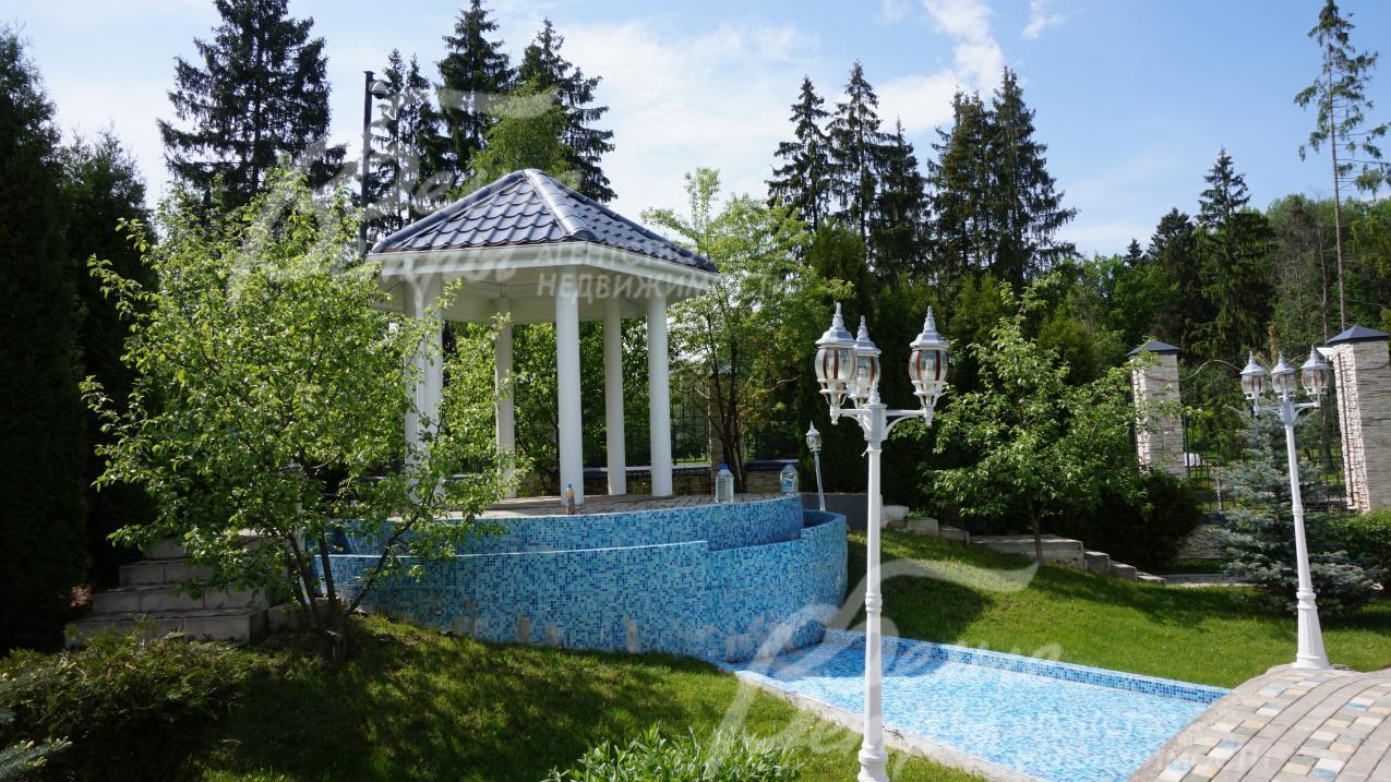Уличный бассейн представляет систему из водопада: "речки" и самого бассейна, имеет круглую форму и в центре остров, куда ведут два моста. Возле бассейна расположена зона отдыха около 100 кв.м под крышей, которая стоит на пяти каменных колоннах высотой 3 м, внутри садовая мебель и мангал. Также есть небольшая беседка на вершине водопада около 15 кв.м каменная в едином архитектурном стиле всего комплекса. Вольер для собак. На участке 200 соток сделана спортивная площадка.