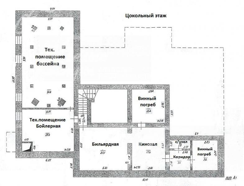 Цоколь: домашний кинотеатр 17 кв.м, бильярдный зал 25 кв.м, винная комната 13 кв.м и винный погреб 9 кв.м, холл 5 кв.м, с/узел, подсобное техническое помещение бассейна 55 кв.м, бойлерная-вентиляционная 25 кв.м