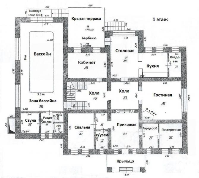 1-ый этаж: крыльцо 11 кв.м, прихожая 17 кв.м, гардеробная 6.7 кв.м, постирочная 10 кв.м, гостевая спальня 16 кв.м, тамбур-гардеробная 4 кв.м, гостевой с/узел 4 кв.м, холл 13.5 кв.м, гостиная с камином 27 кв.м, кухня-столовая 33 кв.м с кладовой 5.5 кв.м, выход на крытую террасу 26 кв.м с зоной барбекю, кабинет 18 кв.м, холл 13 кв.м Зона бассейна 67 кв.м с выходом на террасу: чаша бассейна 8х3.3 м глубиной 1.9 м, сауна 6.6 кв.м, раздевалка 4.4 кв.м, душевая и с/узел