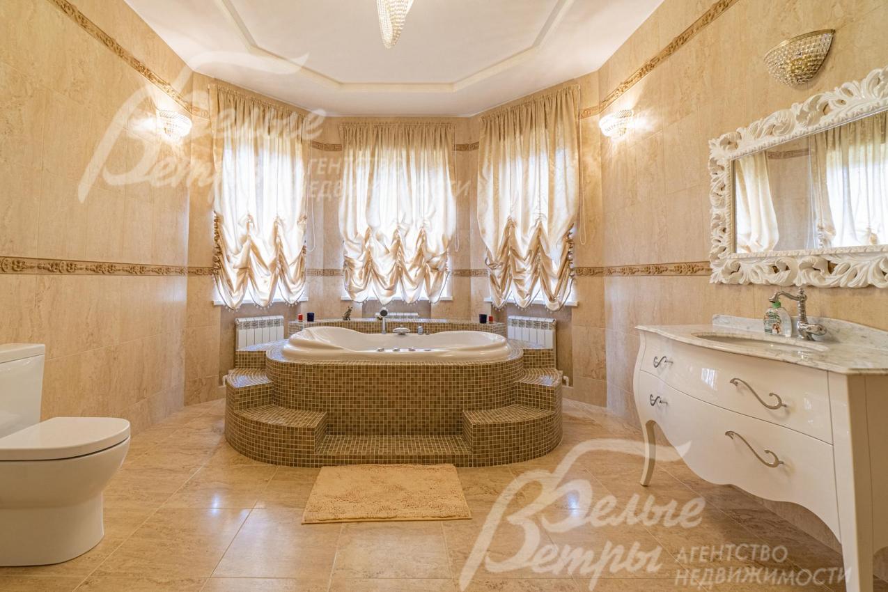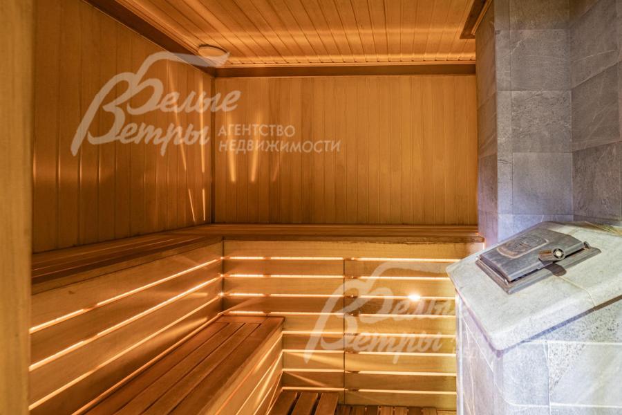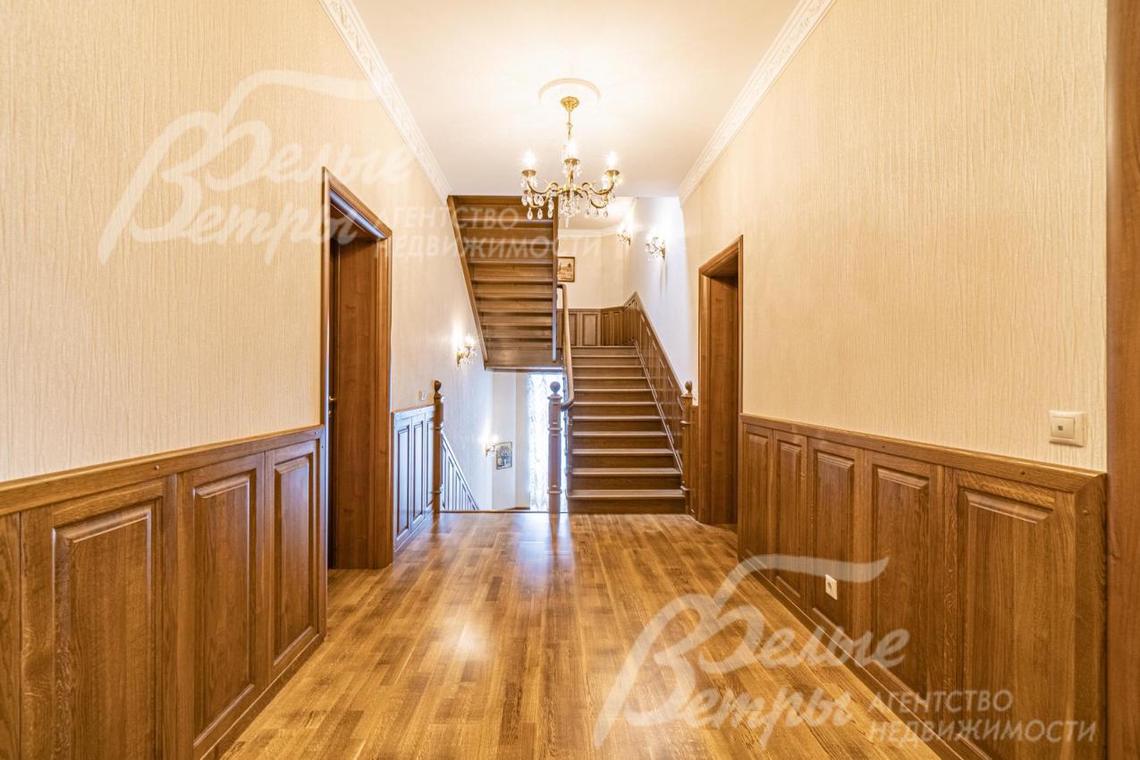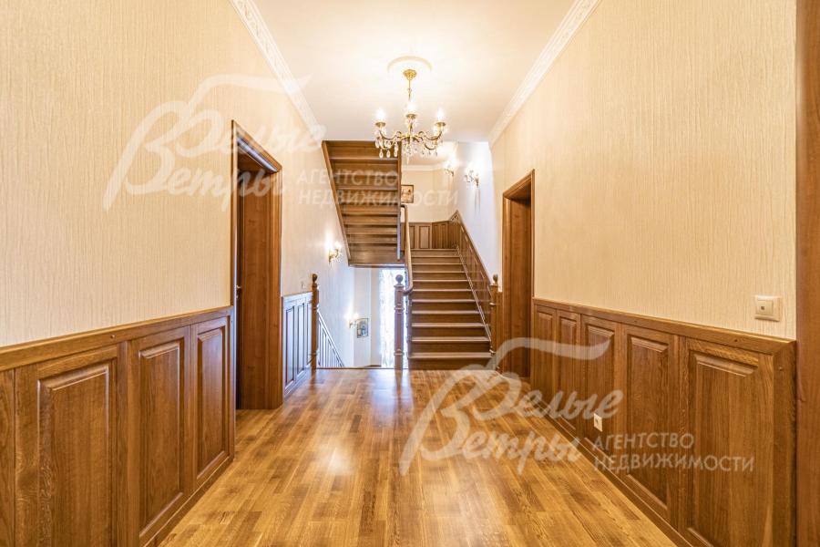 Описание внутренней отделки: отделка дорогими натуральными материалами. На стенах обои с шелкографией. Ценными породами дерева (панелями высотой 80 см) отделаны стены вдоль лестницы и по периметру разных помещений. Полы 1-го этажа покрыт почти везде (кроме Гостиной и жилой комнаты) и санузлов отделаны плиткой с водяным теплым полом, есть художественные панно. На 2-м этаже - паркетная доска, пол мансарды - ковровое покрытие. Лестничный марш - широкий, из массива орехового дерева. В Гостиной - две колонны. Камин отделан мрамором в классическом стиле. Сантехника ведущих брендов, включая две джакузи, многофункциональные душевые кабины. Двери из красного дерева (высотой 2.1 м), Проемы в холлах и гостиной высотой 270см и большой встроенный шкаф отделаны массивом ореха и дуба. между кухней и столовой - большие раздвижные двери с матовым стеклом. В Бане: печь Kastor Prezident (Финляндия) каминного типа, закрытая (не открытая каменка), облицована талькохлоридом; полки парной - из канадского кедра и абаша, финская стеклянная дверь "волна"; освещение Cariitti.