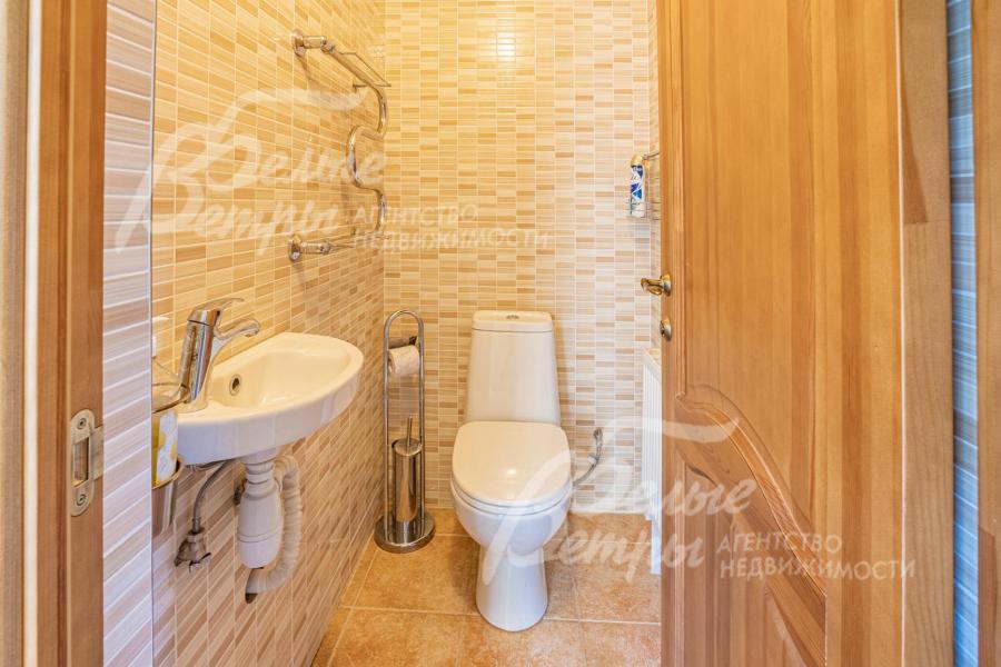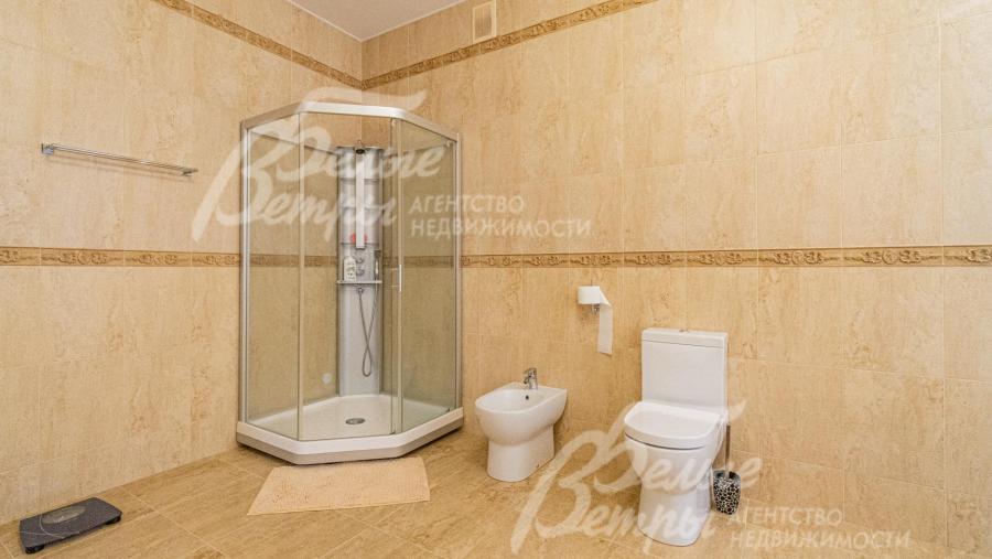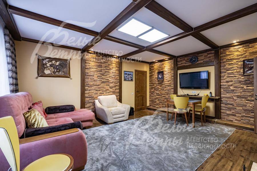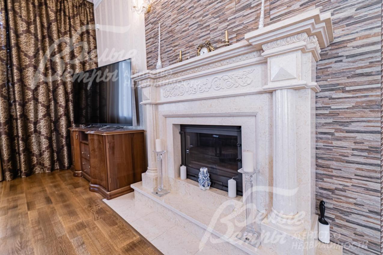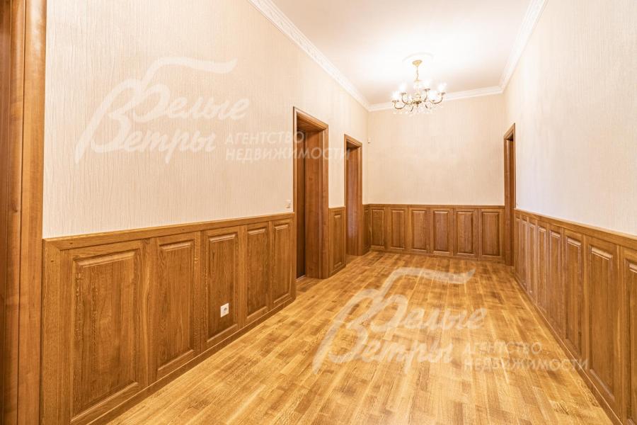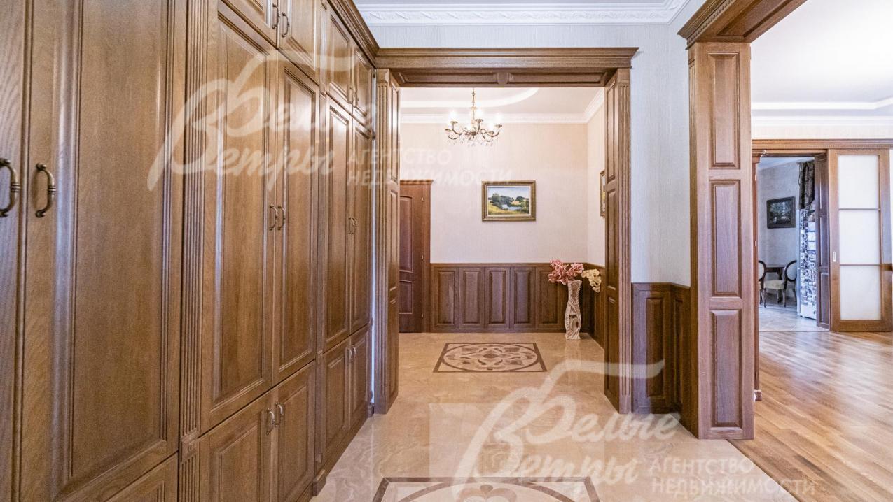 Описание внутренней отделки: отделка дорогими натуральными материалами. На стенах обои с шелкографией. Ценными породами дерева (панелями высотой 80 см) отделаны стены вдоль лестницы и по периметру разных помещений. Полы 1-го этажа покрыт почти везде (кроме Гостиной и жилой комнаты) и санузлов отделаны плиткой с водяным теплым полом, есть художественные панно. На 2-м этаже - паркетная доска, пол мансарды - ковровое покрытие. Лестничный марш - широкий, из массива орехового дерева. В Гостиной - две колонны. Камин отделан мрамором в классическом стиле. Сантехника ведущих брендов, включая две джакузи, многофункциональные душевые кабины. Двери из красного дерева (высотой 2.1 м), Проемы в холлах и гостиной высотой 270см и большой встроенный шкаф отделаны массивом ореха и дуба. между кухней и столовой - большие раздвижные двери с матовым стеклом. В Бане: печь Kastor Prezident (Финляндия) каминного типа, закрытая (не открытая каменка), облицована талькохлоридом; полки парной - из канадского кедра и абаша, финская стеклянная дверь "волна"; освещение Cariitti.