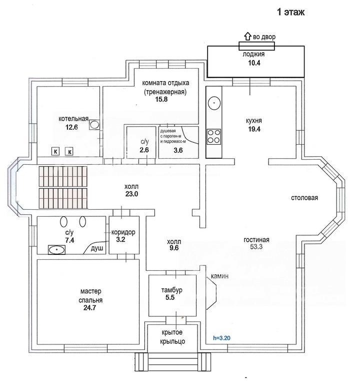 1-ый этаж: крытое крыльцо, тамбур 5.5 кв.м, холл 10 кв.м, столовая-гостиная с камином 53 кв.м, кухня 19 кв.м с выходом на лоджию 10.4 кв.м, мастер-спальня 25 кв.м со своим санузлом 7 кв.м; комната отдыха с тренажером (беговой дорожкой) 16 кв.м и душевой кабиной с парогенератором (аналог хамам), санузел гостевой 3 кв.м, котельная со станцией водоочистки 13 кв.м, коридор 23 кв.м;