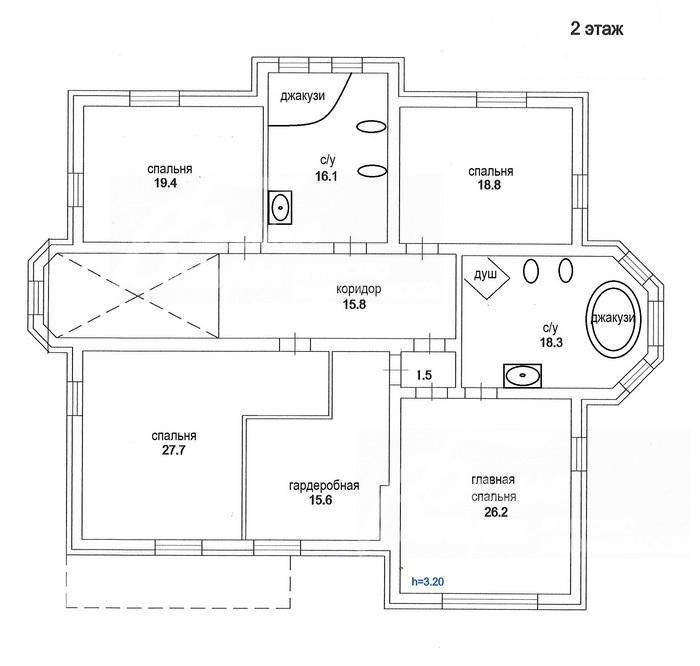 2-ой этаж: холл 16 кв.м; мастер-спальня 26.2 кв.м с своим санузлом 18.3 кв.м (с окном, джакузи, душевой кабиной, биде) и гардеробной 15.6 кв.м; спальня 19.4 кв.м, спальня 18.8 кв.м, спальня 27.7 кв.м, общий санузел 16 кв.м (с джакузи, биде)