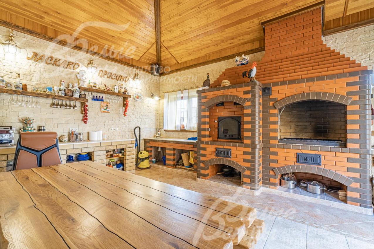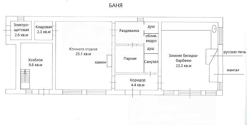 - вспомогательное кирпичное строение (баня, зимняя беседка-барбекю, хозблок) 90 кв.м, подключенное к централизованным водопроводу и канализации, в едином стиле с жилым домом. В зоне бане: комната отдыха 25 кв.м с камином, раздевалка, парная, душевая с обливным ведром, туалет, кладовка. В хозяйственной части: электро-щитовая с выравнивающим напряжение оборудованием, хозблок, бетонированный погреб с вытяжной вентиляцией 10 кв.м; также большое чердачное пространство для хранения стройматериалов и инструментов.