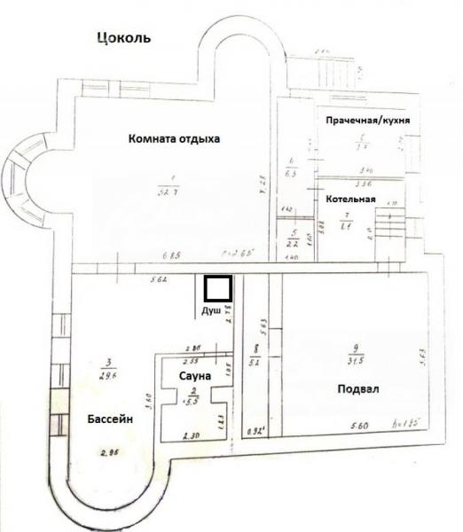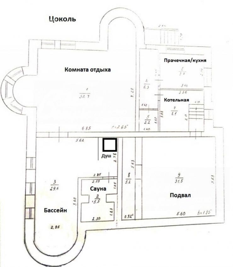 Цоколь: холл 6 кв.м, комната отдыха/тренажерная 53 кв.м, бассейн 29 кв.м с душевой, сауна 5.5 кв.м, санузел 2 кв.м, постирочная 9 кв.м, котельная 8 кв.м с выходом в холодный подвал + комната с оборудованием для бассейна 31.5 кв.м.