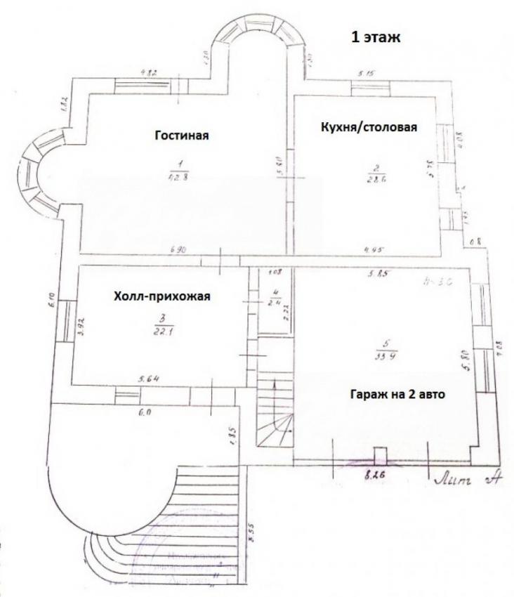 1-ый этаж: гараж на 2 а/м 34 кв.м, холл-прихожая 22 кв.м с выходом на крыльцо-террасу 10 кв.м, каминный зал 43 кв.м с выходом на участок, кухня -столовая 29 кв.м, гостевой санузел.