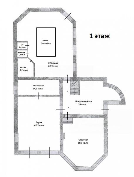 1-ый этаж: гараж на 2 а/м с автоматическими воротами, тех.помещение, прихожая, бассейн (купель 3х4) восьмигранный, сауна, душ, с/узел, выход на веранду