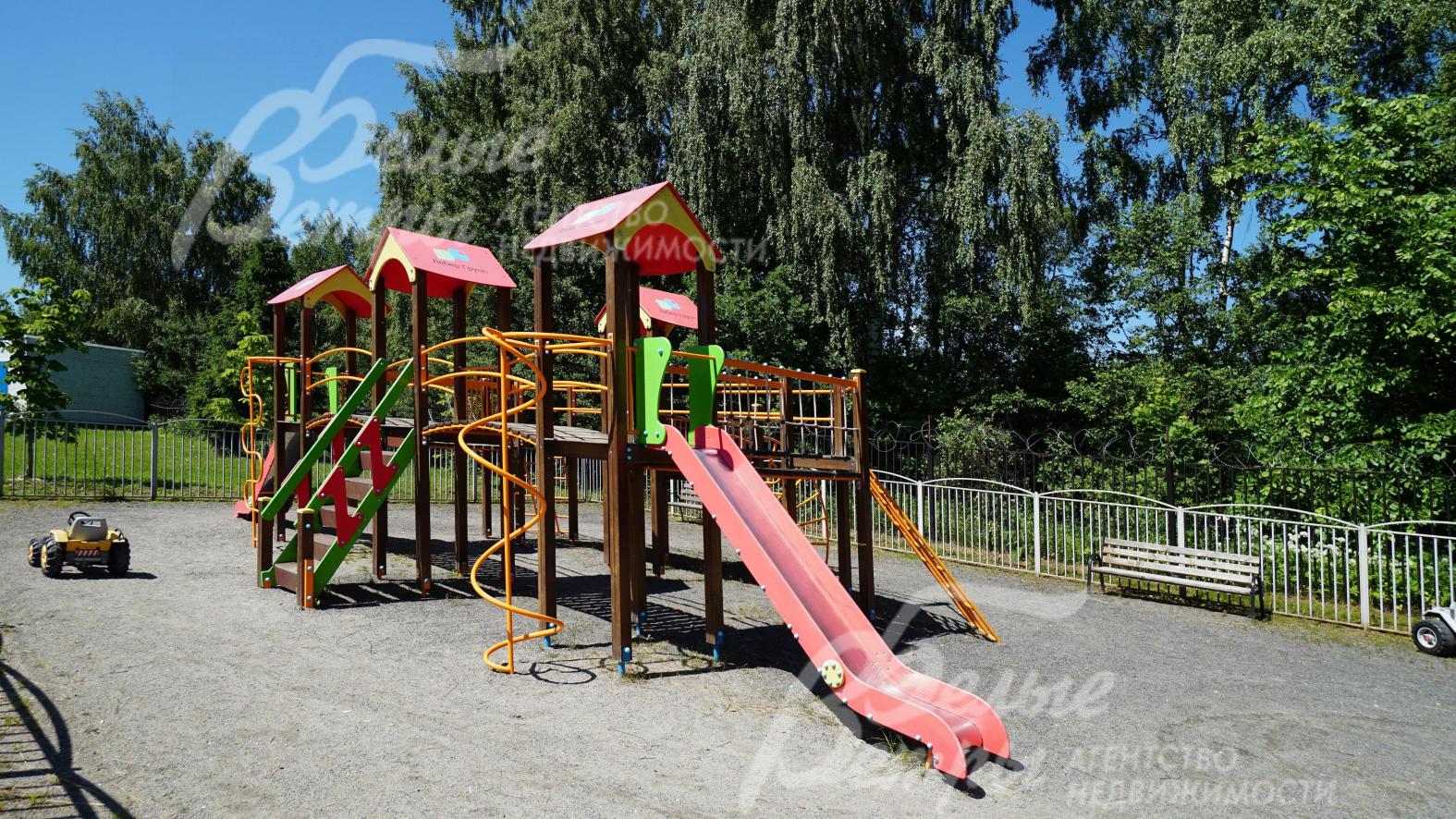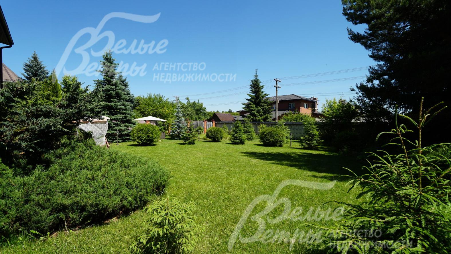 На участке выполнен ландшафтный дизайн: есть газон, дорожки, высажены деревья и кустарники