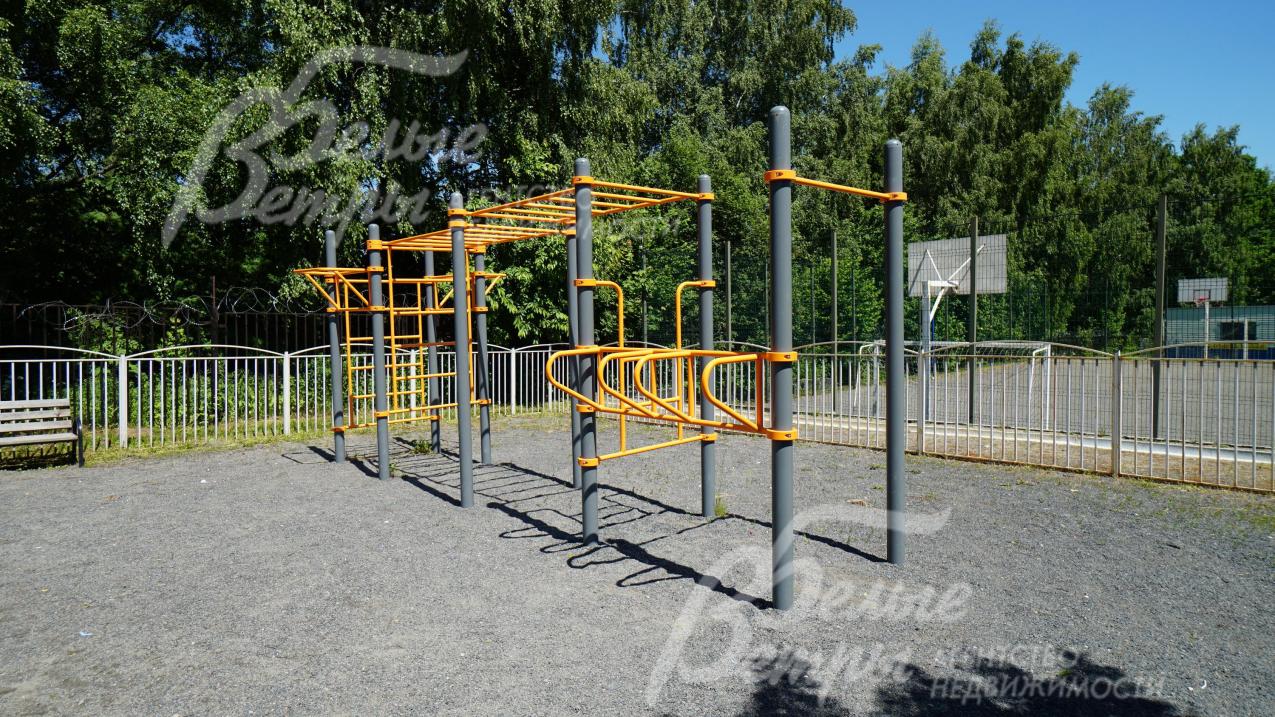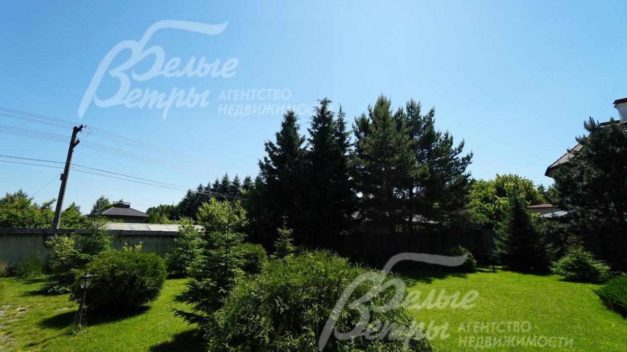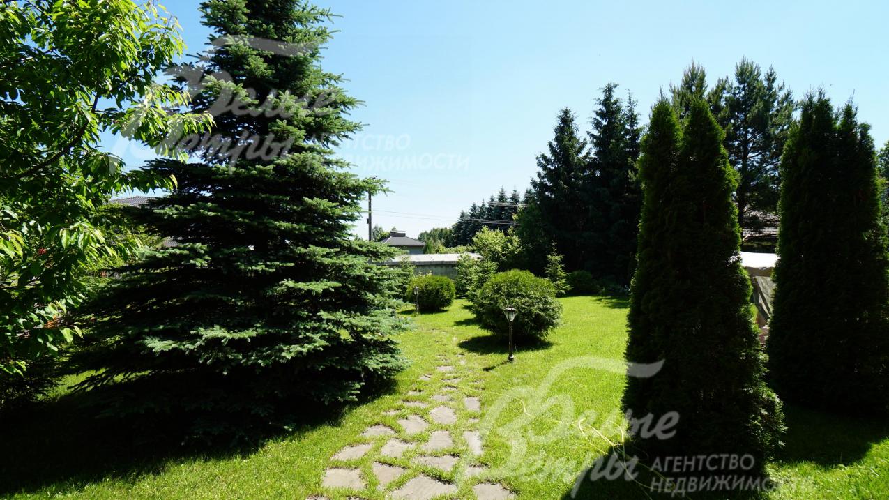 На участке выполнен ландшафтный дизайн: есть газон, дорожки, высажены деревья и кустарники
