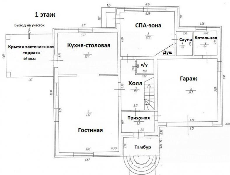 1-ый этаж: тамбур 6 кв.м, прихожая 6 кв.м, холл 12 кв.м, с/узел, гостиная 42 кв.м, кухня-столовая 23 кв.м с выходом на крытую застекленную террасу 16 кв.м с выходом на участок; СПА-зона 22 кв.м с душевой и сауной, бойлерная 4.4 кв.м, гараж 34 кв.м