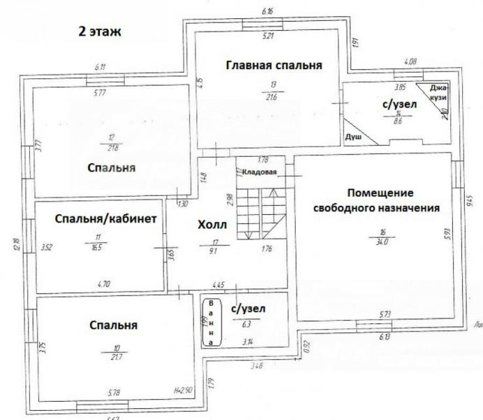 2-ой этаж: комната свободного назначения (межэтажная) 34 кв.м, холл 9 кв.м, Главная спальня 22 кв.м с с/узлом 8.6 кв.м (с угловой ванной-джакузи и душевой кабиной), две спальни по 22 кв.м, с/узел 6 кв.м с ванной, спальня/кабинет 16.5 кв.м
