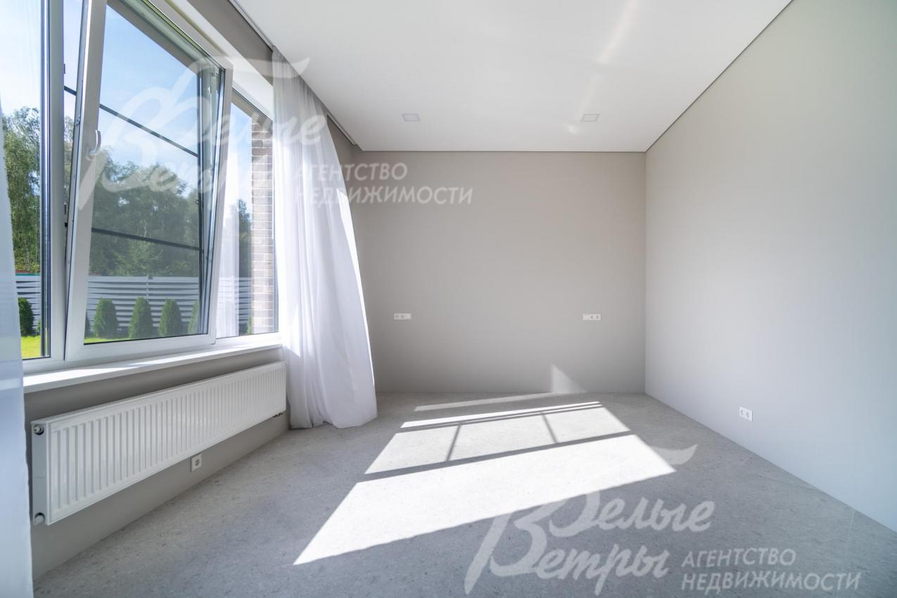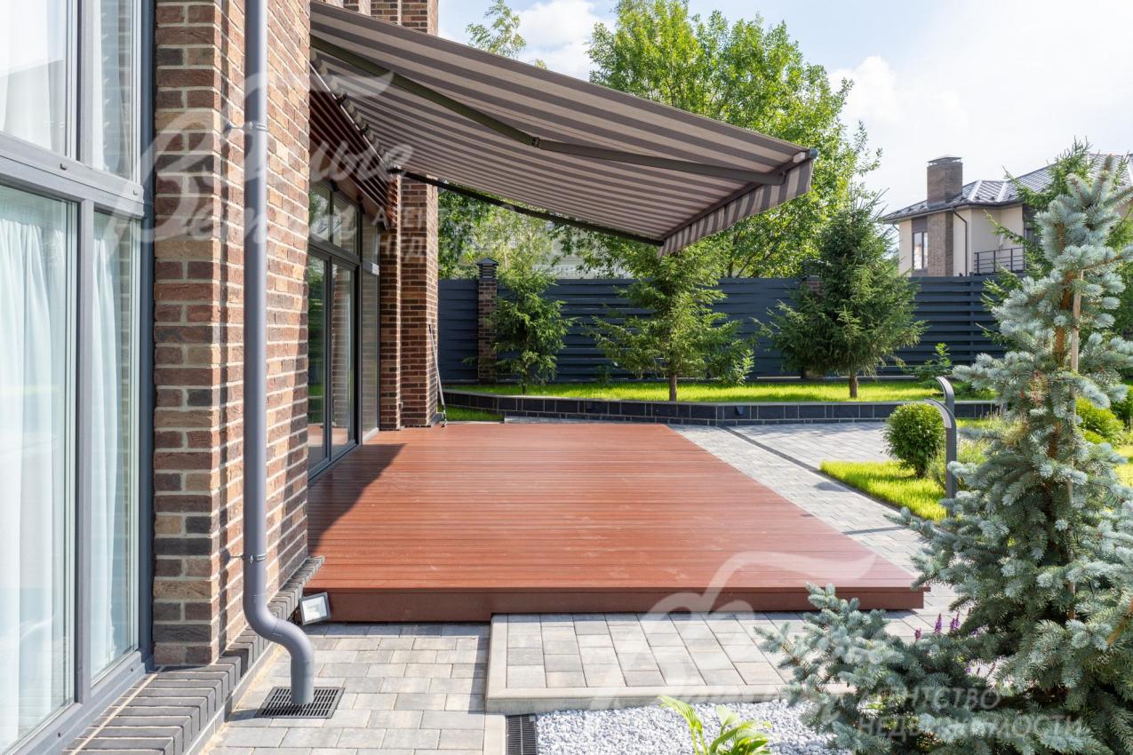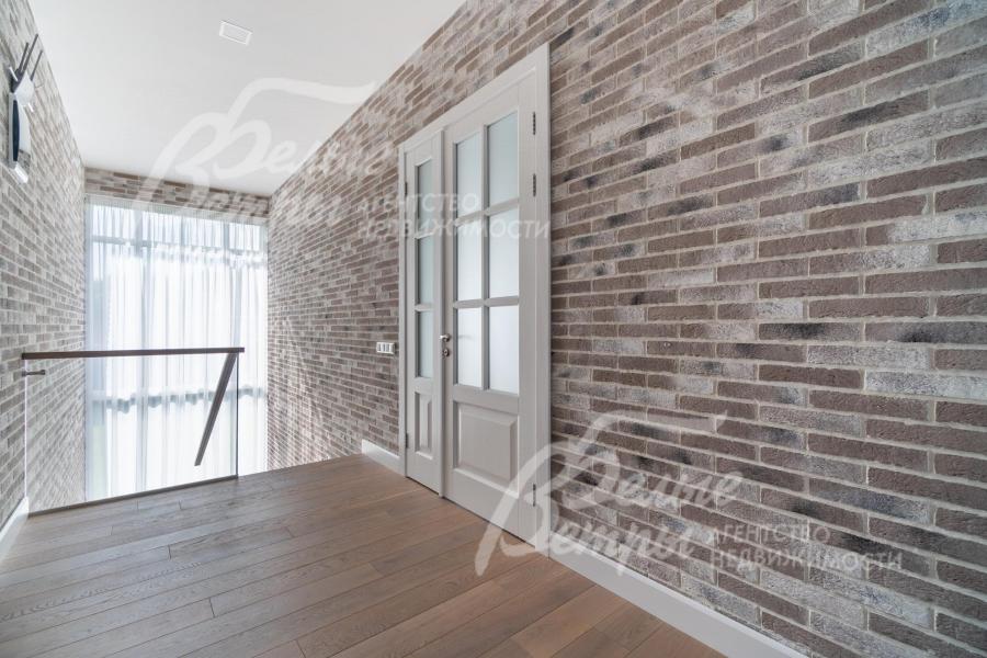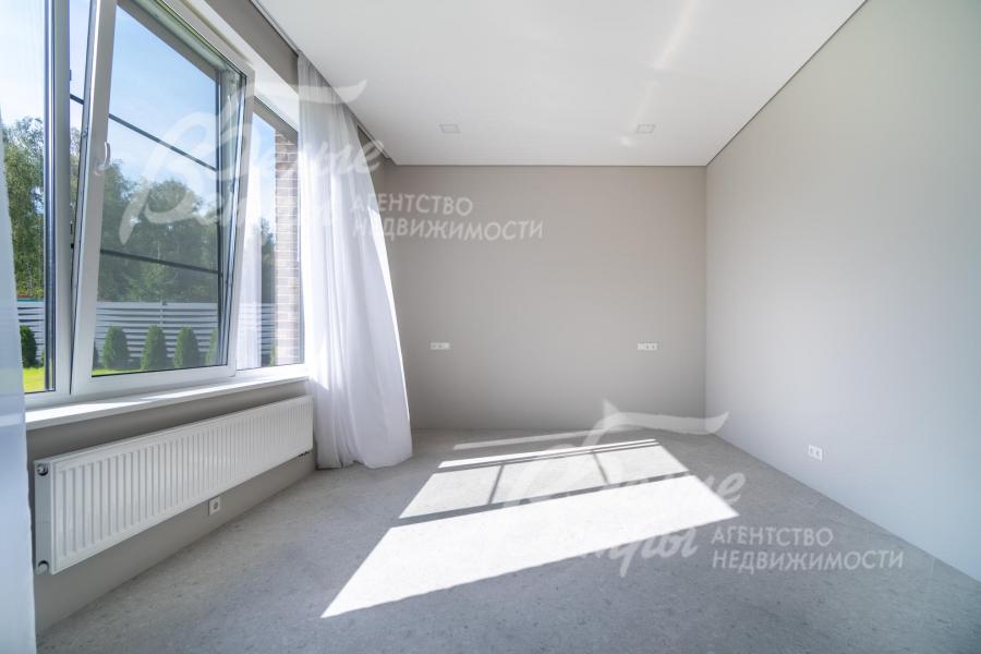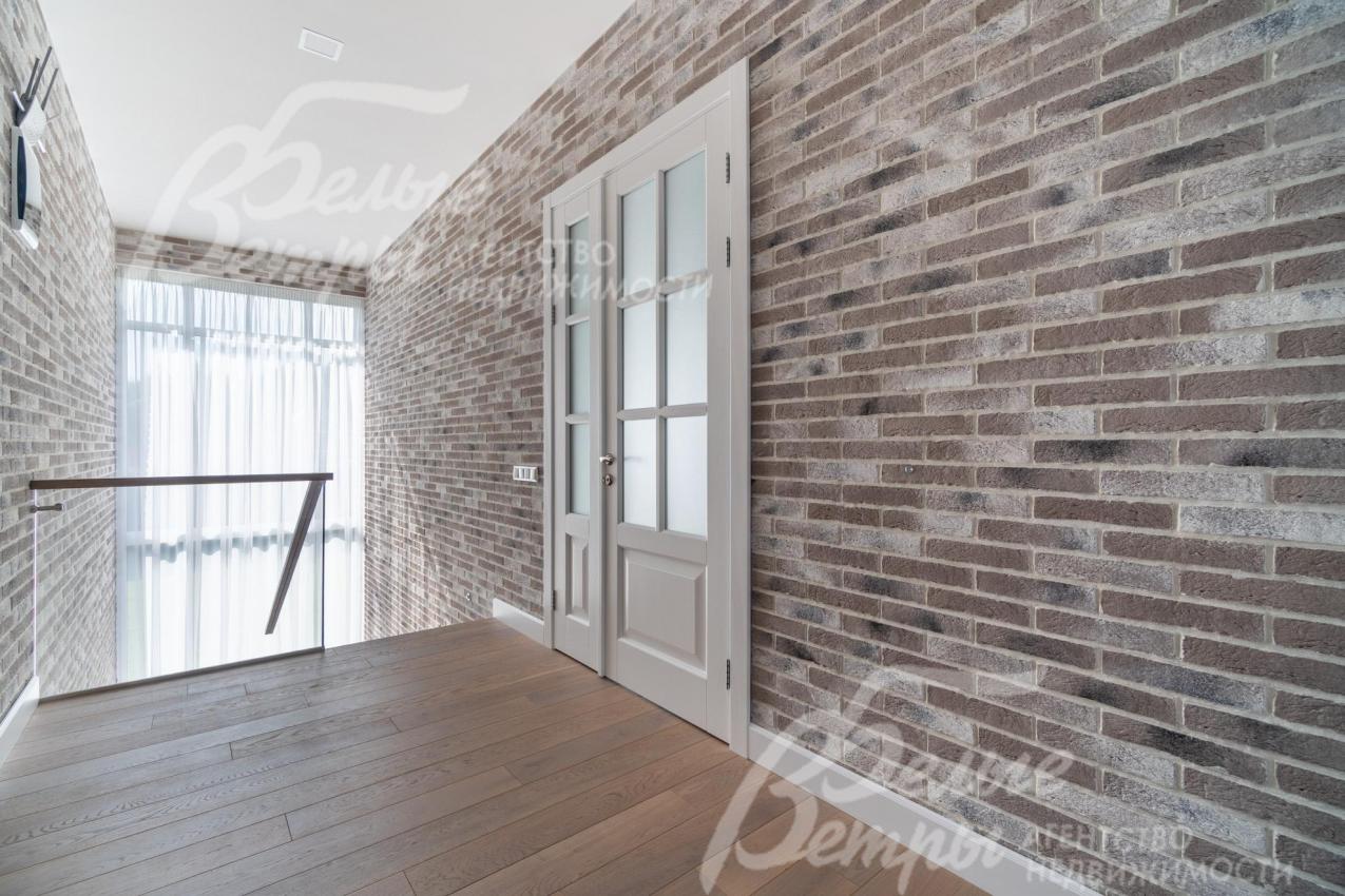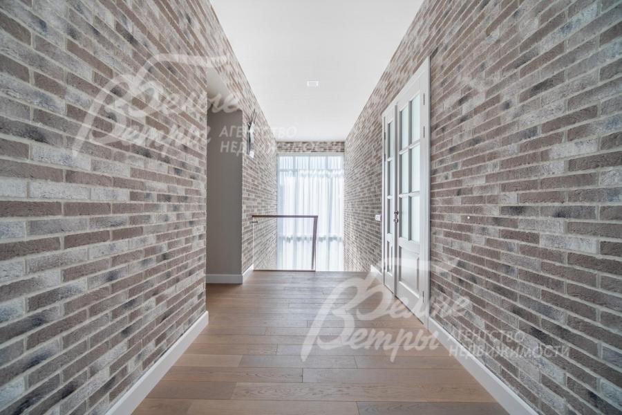 Описание внутренней отделки: интерьер дома выполнен по дизайнерскому проекту с элементами стиля лофт с применением дорогостоящих материалов высокого качества. В холлах стены отделаны декоративной плиткой «под фасадный кирпич», органично продолжающей внешнюю отделку дома в интерьере. Стены в других помещениях окрашены в благородный серый оттенок, приятный для глаз. Стены санузлов оформлены в едином стиле: от пола до потолка - бежевый керамогранит высшего сорта (Keramma Marazzi, имитация мрамора, внешние углы запилены под 45°). В мастер-спальне со стороны изголовья – дизайнерские обои. На полу 1-го этажа и в санузлах 2-го этажа – керамогранит (Keramma Marazzi) с водяным подогревом, в остальных помещениях – дубовая инженерная доска. На полу террасы – лиственница экстра-класса (пол террасы - на одном уровне с полом гостиной). Потолки из гипсокартона, в том числе подвесные, с теневым профилем и подсветкой вдоль карниза, со встроенными стильными потолочными светильниками. Установлены стальные панельные радиаторы белого и чёрного цвета (Kermi и Prado), розетки и выключатели Yung (Германия), в том числе мастер-выключатель. Интерьер дополнен межкомнатными дверьми из массива дуба (филёнчатые лакированные белого цвета с итальянской фурнитурой и с магнитными замками), входным порталом из ПВХ шириной 2 м от пола до потолка с двухкамерным стеклопакетом. На второй этаж ведёт парящая лестница на тонком стальном каркасе со ступенями из клееного дуба (толщина 4 см), ограждение – закаленное стекло, поручни – из массива дуба. В столовой и в спальне (спальня - над столовой) предусмотрена ниша для камина с выводом дымохода на кровлю. В гараже – мойка и вывод воды под шланг: сделан уклон, позволяющий мыть автомобили (стены до потолка отделаны керамогранитом). В котельной – техническая мойка (лапомойка). Фасад дома оснащен современной системой архитектурной подсветки, которая разделена на 4 зоны (ночное фасадное освещение, фасадное освещение между этажами, освещение вдоль дорожек и на заборе) с управлением через пульт. Дорожка от входа на участок до двери дома и площадка перед гаражом – с электрическим подогревом (3 контура). Маркиза на террасе (Франция) 5,5×3,5 м.
