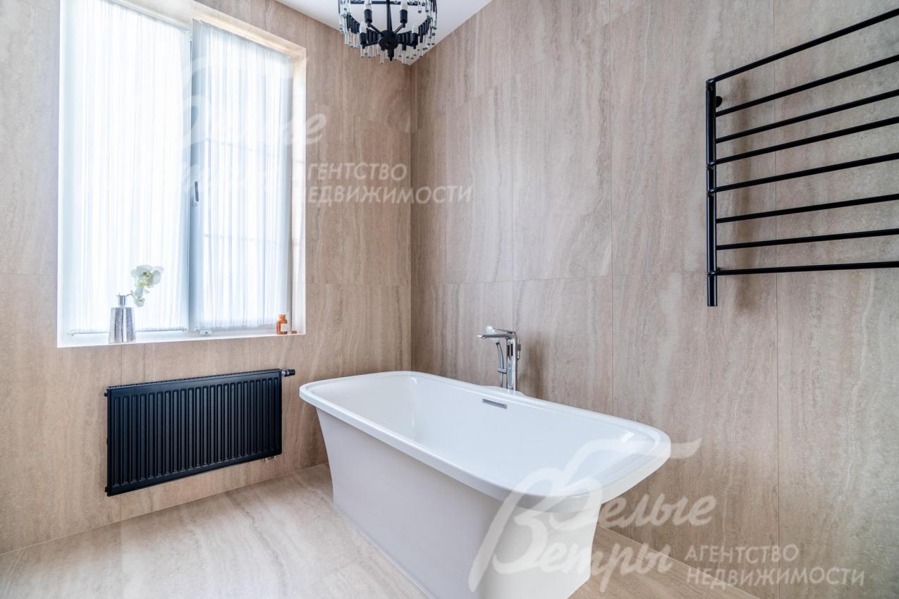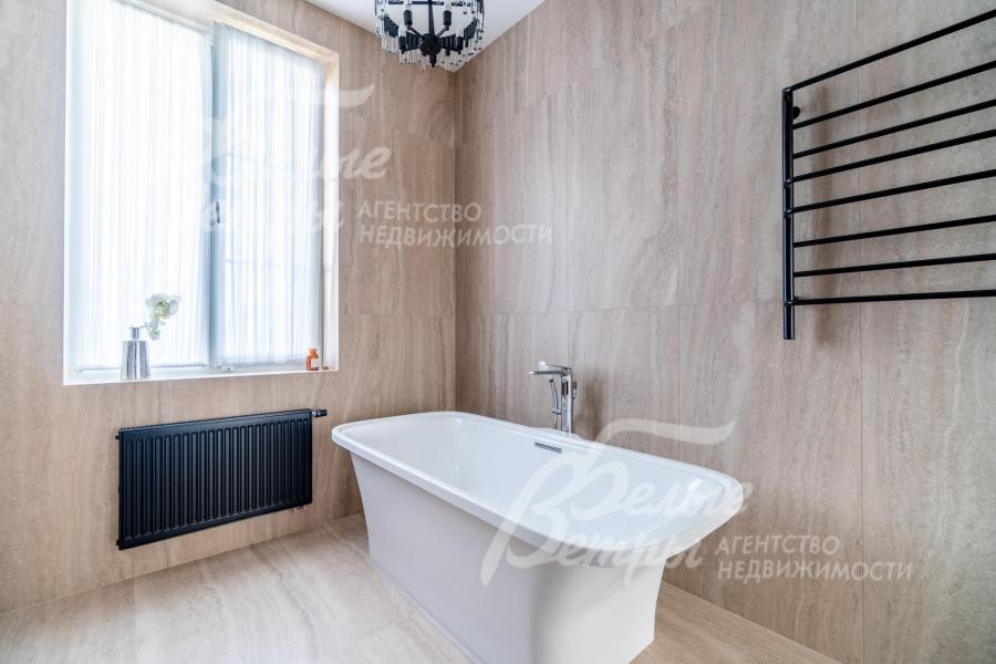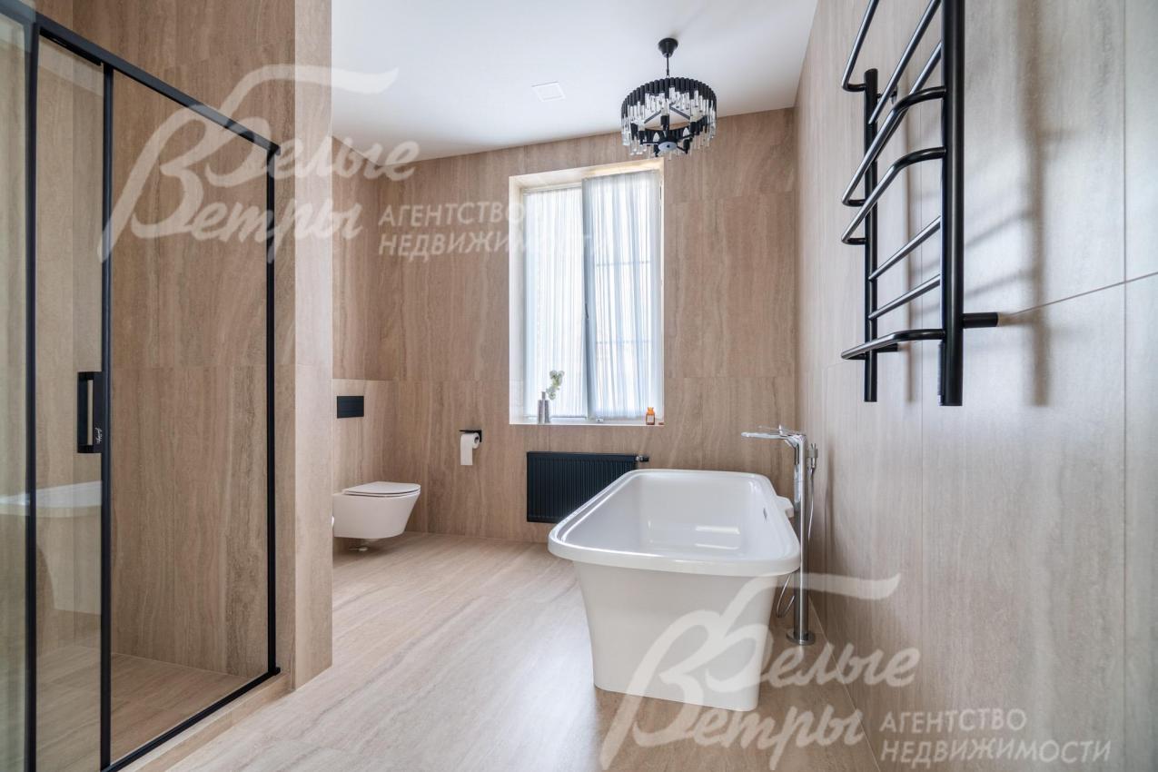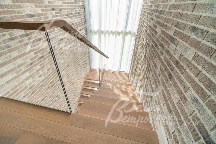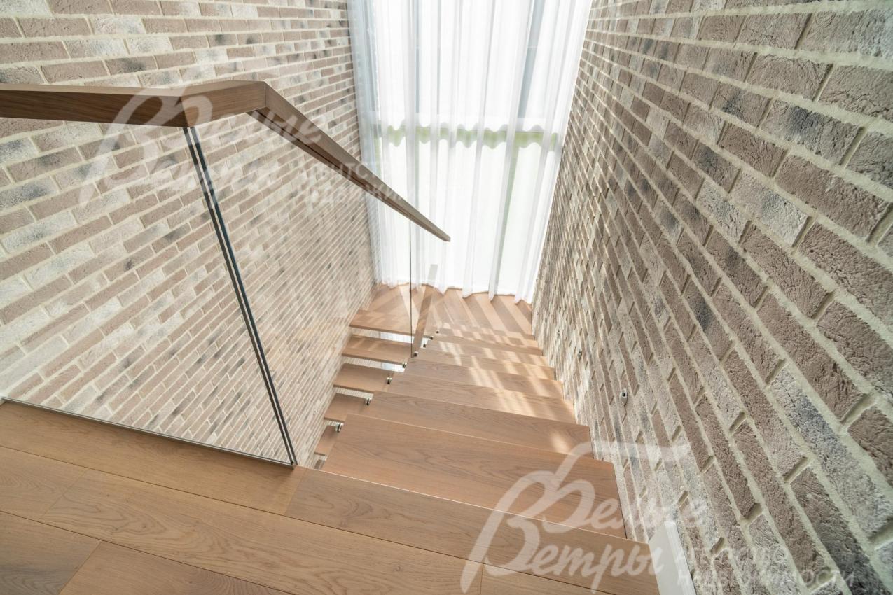 Описание внутренней отделки: интерьер дома выполнен по дизайнерскому проекту с элементами стиля лофт с применением дорогостоящих материалов высокого качества. В холлах стены отделаны декоративной плиткой «под фасадный кирпич», органично продолжающей внешнюю отделку дома в интерьере. Стены в других помещениях окрашены в благородный серый оттенок, приятный для глаз. Стены санузлов оформлены в едином стиле: от пола до потолка - бежевый керамогранит высшего сорта (Keramma Marazzi, имитация мрамора, внешние углы запилены под 45°). В мастер-спальне со стороны изголовья – дизайнерские обои. На полу 1-го этажа и в санузлах 2-го этажа – керамогранит (Keramma Marazzi) с водяным подогревом, в остальных помещениях – дубовая инженерная доска. На полу террасы – лиственница экстра-класса (пол террасы - на одном уровне с полом гостиной). Потолки из гипсокартона, в том числе подвесные, с теневым профилем и подсветкой вдоль карниза, со встроенными стильными потолочными светильниками. Установлены стальные панельные радиаторы белого и чёрного цвета (Kermi и Prado), розетки и выключатели Yung (Германия), в том числе мастер-выключатель. Интерьер дополнен межкомнатными дверьми из массива дуба (филёнчатые лакированные белого цвета с итальянской фурнитурой и с магнитными замками), входным порталом из ПВХ шириной 2 м от пола до потолка с двухкамерным стеклопакетом. На второй этаж ведёт парящая лестница на тонком стальном каркасе со ступенями из клееного дуба (толщина 4 см), ограждение – закаленное стекло, поручни – из массива дуба. В столовой и в спальне (спальня - над столовой) предусмотрена ниша для камина с выводом дымохода на кровлю. В гараже – мойка и вывод воды под шланг: сделан уклон, позволяющий мыть автомобили (стены до потолка отделаны керамогранитом). В котельной – техническая мойка (лапомойка). Фасад дома оснащен современной системой архитектурной подсветки, которая разделена на 4 зоны (ночное фасадное освещение, фасадное освещение между этажами, освещение вдоль дорожек и на заборе) с управлением через пульт. Дорожка от входа на участок до двери дома и площадка перед гаражом – с электрическим подогревом (3 контура). Маркиза на террасе (Франция) 5,5×3,5 м.