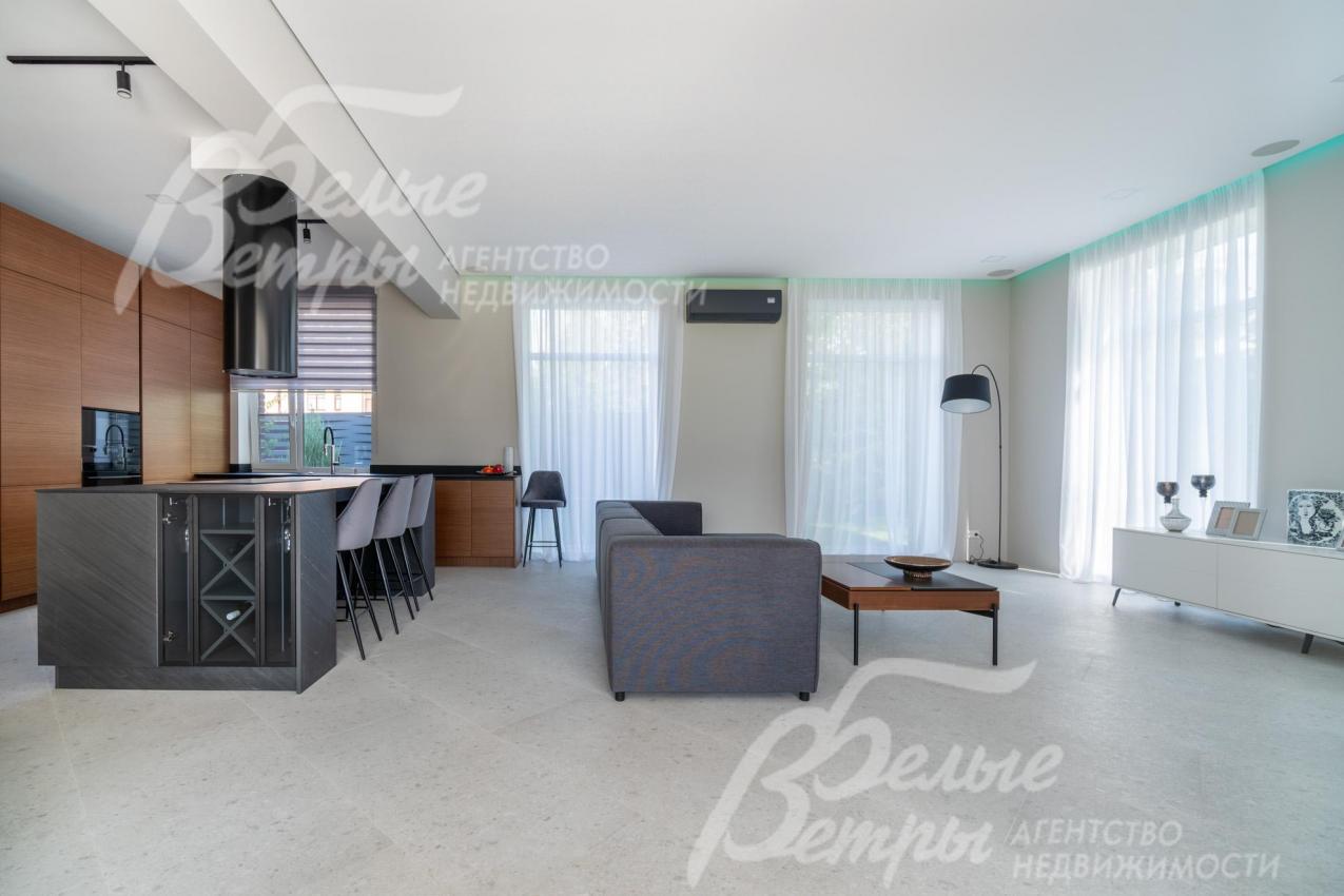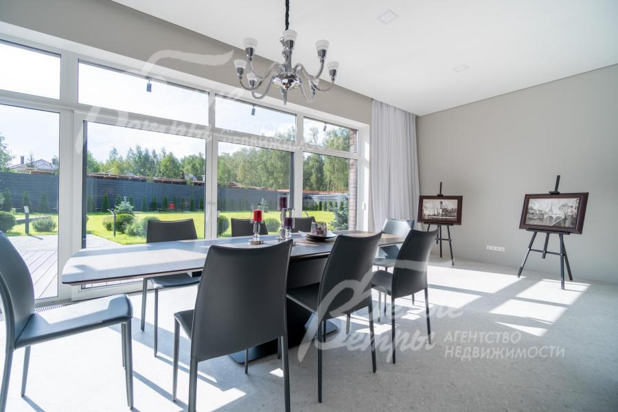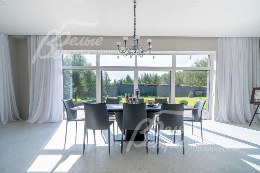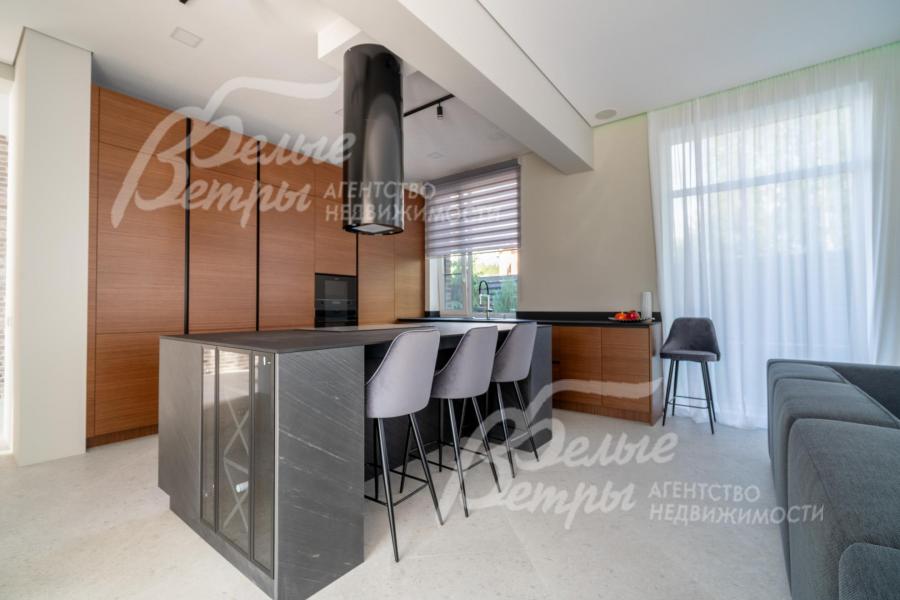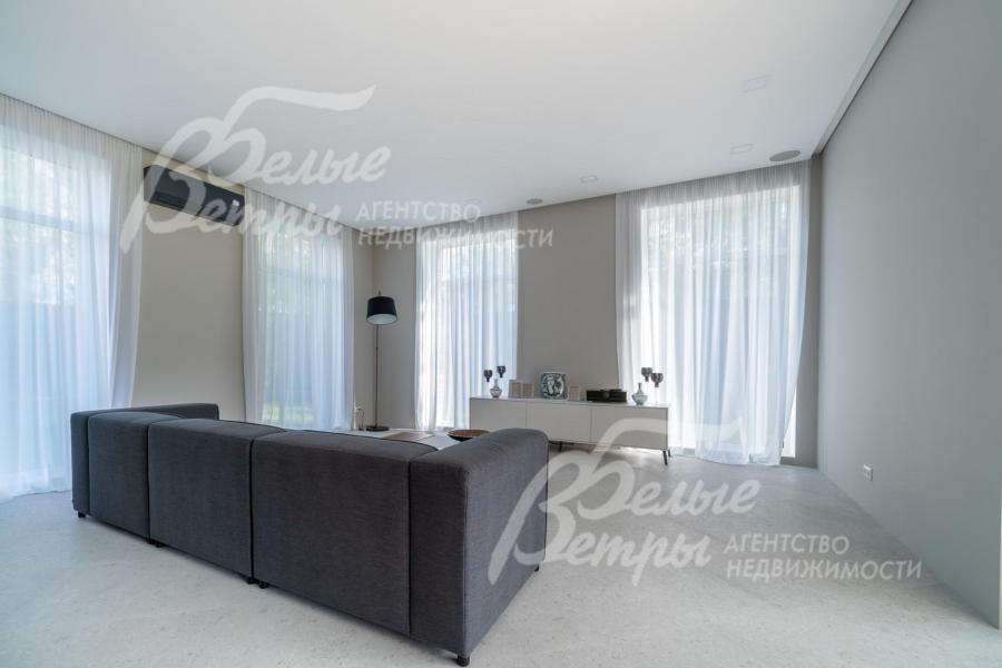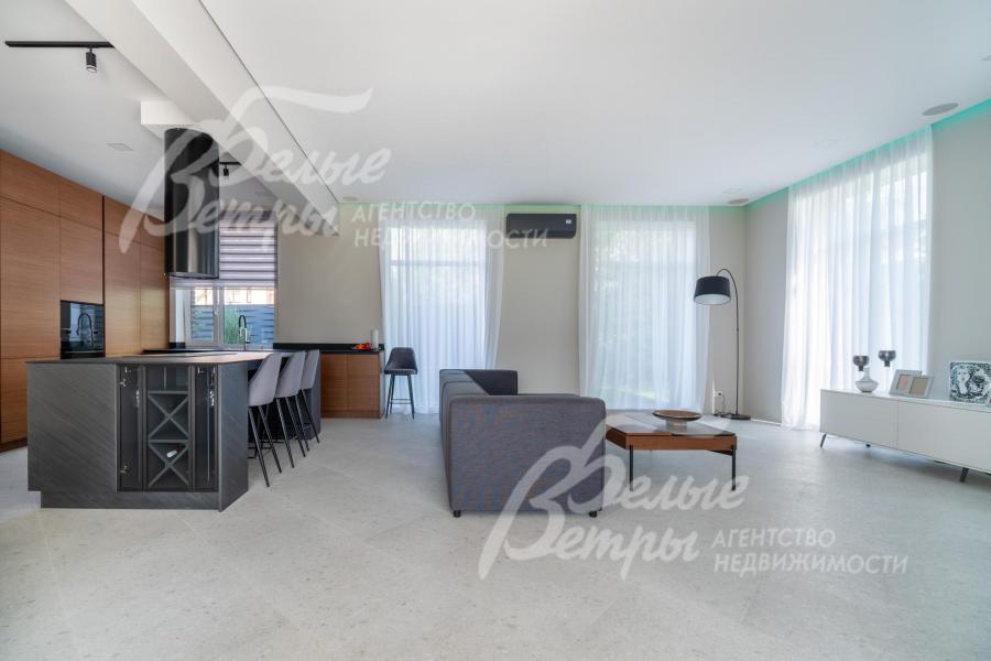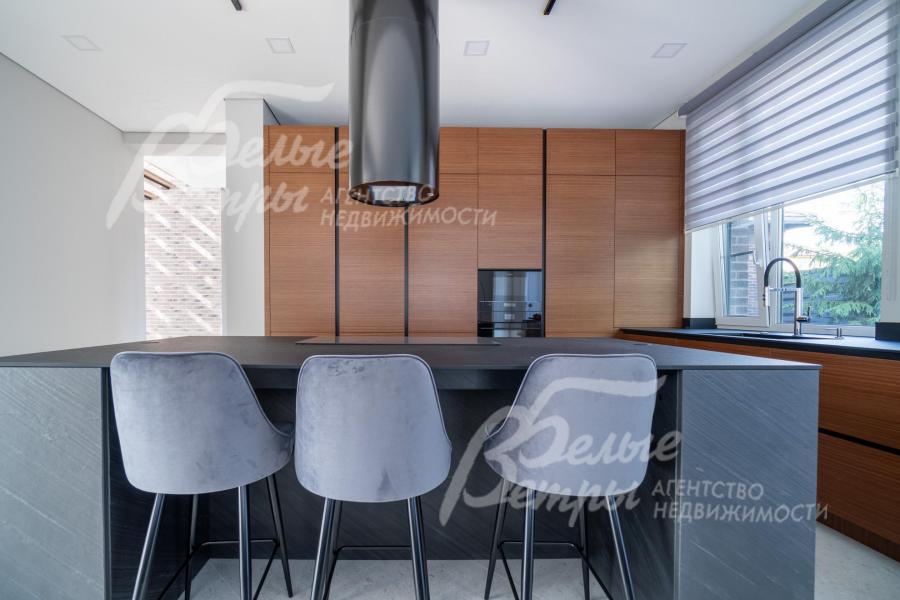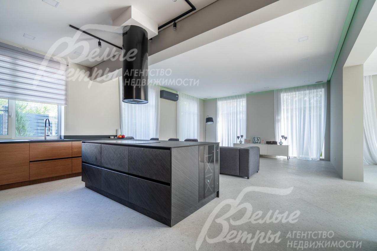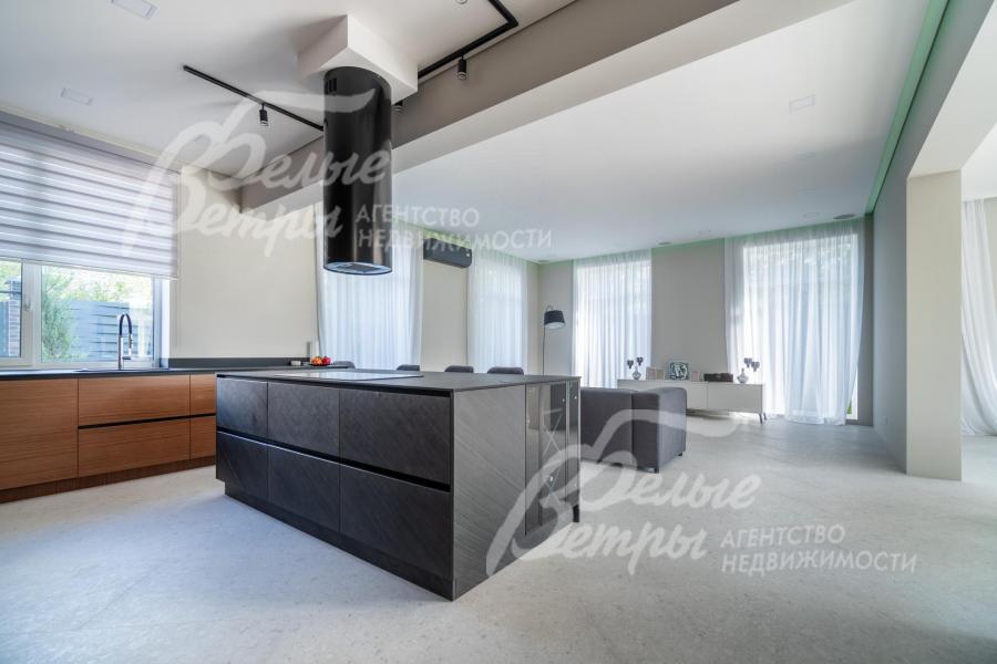 Мебель, оборудование: дом полностью оборудован сантехникой и мебелью в общих помещениях. На кухне – гарнитур с фасадами из шпона ореха, столешница Compact HPL FunderMax, встроенная техника SMEG (двухкамерный холодильник, духовой шкаф, СВЧ, широкая посудомоечная машина, электрическая варочная индукционная поверхность (на острове, 5 конфорок)), измельчитель, потолочная вытяжка (над варочной поверхностью), врезная мойка со смесителем Omoikiri, выдвижные системы хранения – «волшебные» уголки, встроенные выезжающие из столешницы блоки розеток (в трех местах). Кухонный остров 240×120 см – с полубарным столом на 3 персоны и стульями (4 шт.), с фасадами из шпона натурального черного сланца, с 2 витринами с подсветкой. В столовой – раздвижной обеденный стол (BoConcept (Дания) на 8-12 персон с кожаными стульями. В гостиной вся мебель BoConcept (Дания): большой диван, журнальный столик, трансформируемый под кофейный, тумба под телевизор, напольный светильник. В прихожей установлен встроенный шкаф до потолка с зоной для обуви на теплом полу. В гардеробной мастер-спальни - система хранения открытого типа. Во всех комнатах – тюль на скрытом карнизе. Светильники и люстры - от немецких производителей. В квартире персонала: кухонный гарнитур с техникой (холодильник, варочная поверхность, духовка), встроенный шкаф в прихожей и сантехника. Вся сантехника от Jacob Delafon (производство- Франция): унитазы, раковины, душевые смесители с терморегуляторами, гигиенические души, также электрические полотенцесушители, трапы с двойным затвором (сухой и мокрый): фурнитура (профили душевых кабин, кнопки инсталляций, держатели бумаги, полотенцесушители) – черного цвета; в мастер-блоке - отдельно-стоящая ванна из искусственного камня, биде.