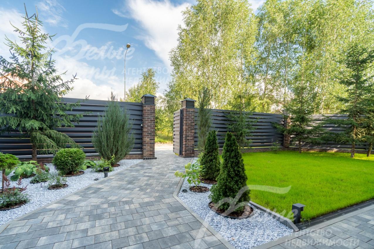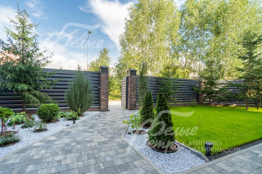 Благоустройство участка: на участке выполнен дорогостоящий и эффектный проект ландшафтного дизайна. Перед входом в дом расположены две клумбы, где высажены декоративные туи, кусты лаванды, цветы. Рядом со входом и вдоль одной стороны забора - взрослые природные ели (15 шт.). По внутреннему периметру - маленькие туи (60 шт.). Вокруг террасы – шаровидные туи, кусты лаванды и шалфея. Дорожки вымощены, с освещением. Есть автополив на 5 зон. Перед фасадным забором – брусчатая парковка на 6 автомобилей с электрическим подогревом (глубина – 4,4 см). Вокруг дома и по всему участку проложен дренаж