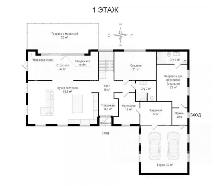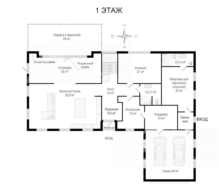 1-ый этаж: крытое крыльцо, прихожая 8,5 кв.м, холл 16 кв.м, кухня-гостиная 52,5 кв.м с островом и полубарным столом и выходом на террасу 26 кв.м (7,5×3,5 м), покрытую лиственницей экстра-класса, столовая 32 кв.м с выходом на участок, спальня 21 кв.м, санузел с душевой 7 кв.м, кладовая 12 кв.м, котельная 12 кв.м, тёплый гараж на 2 автомобиля 39 кв.м;