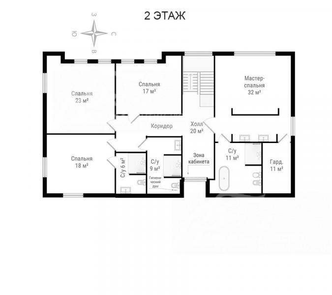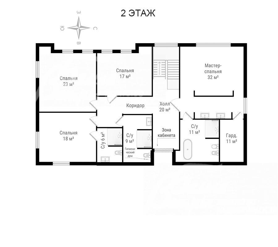 2-ой этаж: холл 20 кв.м, мастер-спальня 32 кв.м с гардеробной 8 кв.м и санузлом с ванной, душевой и биде 11 кв.м, спальня 18 кв.м с санузлом с душевой 6 кв.м, спальня 17 кв.м, спальня 23 кв.м, санузел с душевой 9 кв.м