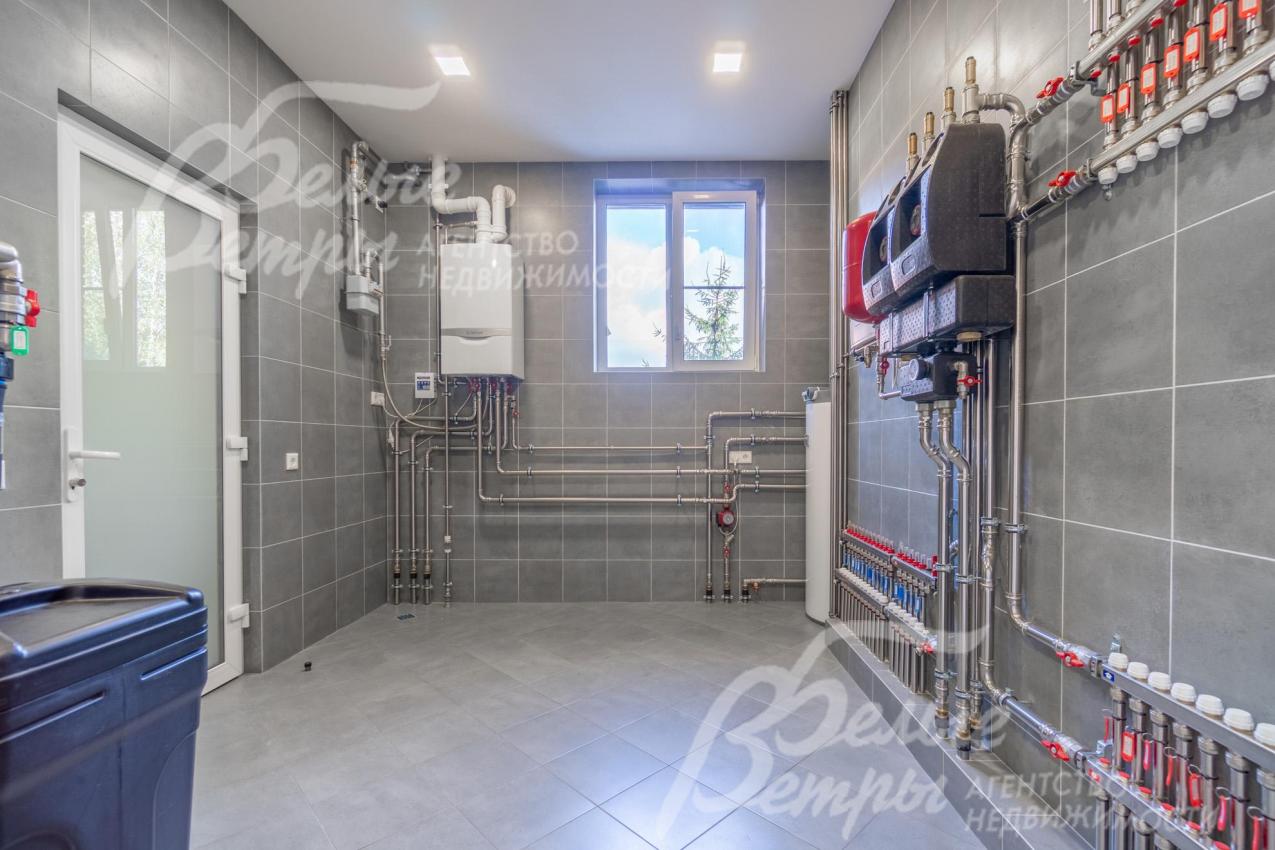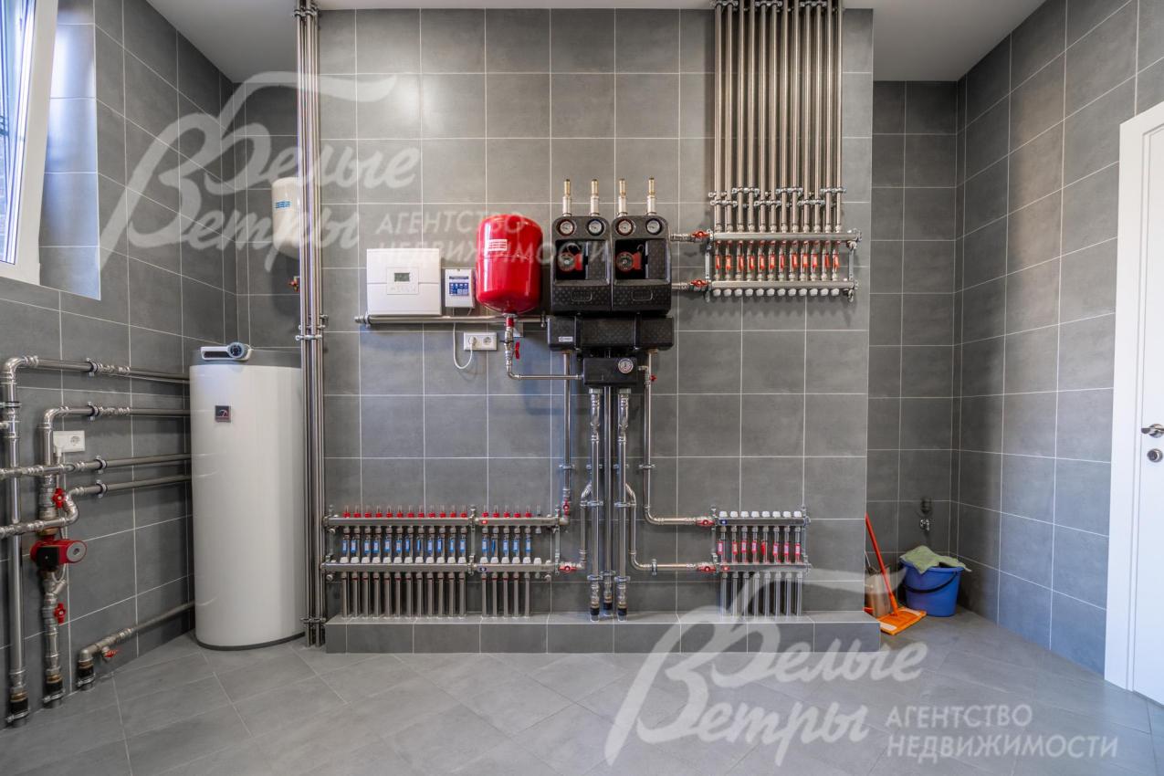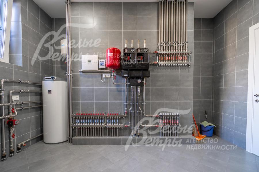 Инженерное обеспечение: Дом оснащен передовыми инженерными системами. Отопление – газовый котёл Vaillant (обвязка - из нержавеющей стали, котёл управляется с телефона, отдельно регулируются приборы и контуры отопления на каждом этаже, насосы – Grundfos). Горячее водоснабжение – через бойлер на 200 л (Drazice, Австрия). Установлена многоступенчатая система очистки воды, сплит-система кондиционирования Haier в гостиной и мастер-спальне (внутренние блоки чёрного цвета), мастер-выключатель, wi-fi роутер, видеодомофон, видеонаблюдение с датчиками движения (камеры на передний и на задний фасады). В мастер-спальне и в гостиной выполнена подготовка под домашний кинотеатр: в гостиной в потолок вмонтированы 5 качественных колонок (Sonans, США), предусмотрено место и выводы под выезжающий проектор (пространство над потолком) и экран; в мастер-спальне в потолок вмонтированы 5 колонок и также разведена акустика (США, 100 Вт). В кухне-гостиной – динамическая подсветка (ротация цвета освещения на карнизах). Во всех помещениях – система Neptun (защита от протечек), дополняет трапы. Гараж оснащён автоматическими воротами Herrmann, проём 5 м (въезд в заборе). 6 систем дома могут управляться со смартфона: отопление, кондиционирование, домофон, видеокамеры, автополив