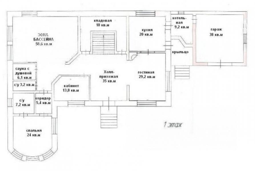 1-ый этаж: холл-прихожая 35 кв.м со вторым светом, кабинет 14 кв.м, гостиная с камином 29 кв.м, кухня 20 кв.м с выходом во двор, спальня 24 кв.м с с/узлом 7 кв.м, зона отдыха с бассейном 58 кв.м (чаша 5.5х4.2 м глубиной 2 м с противотоком), сауна с душевой 6 кв.м, с/узел, котельная 9 кв.м с входом в гараж 38 кв.м