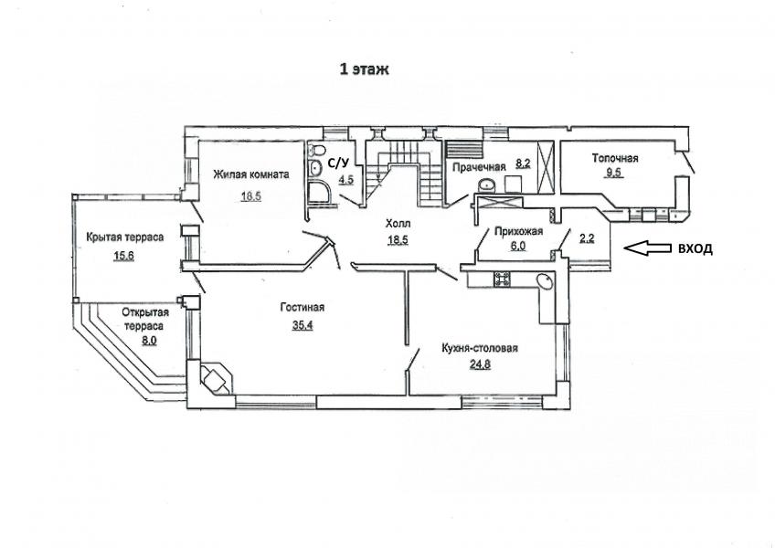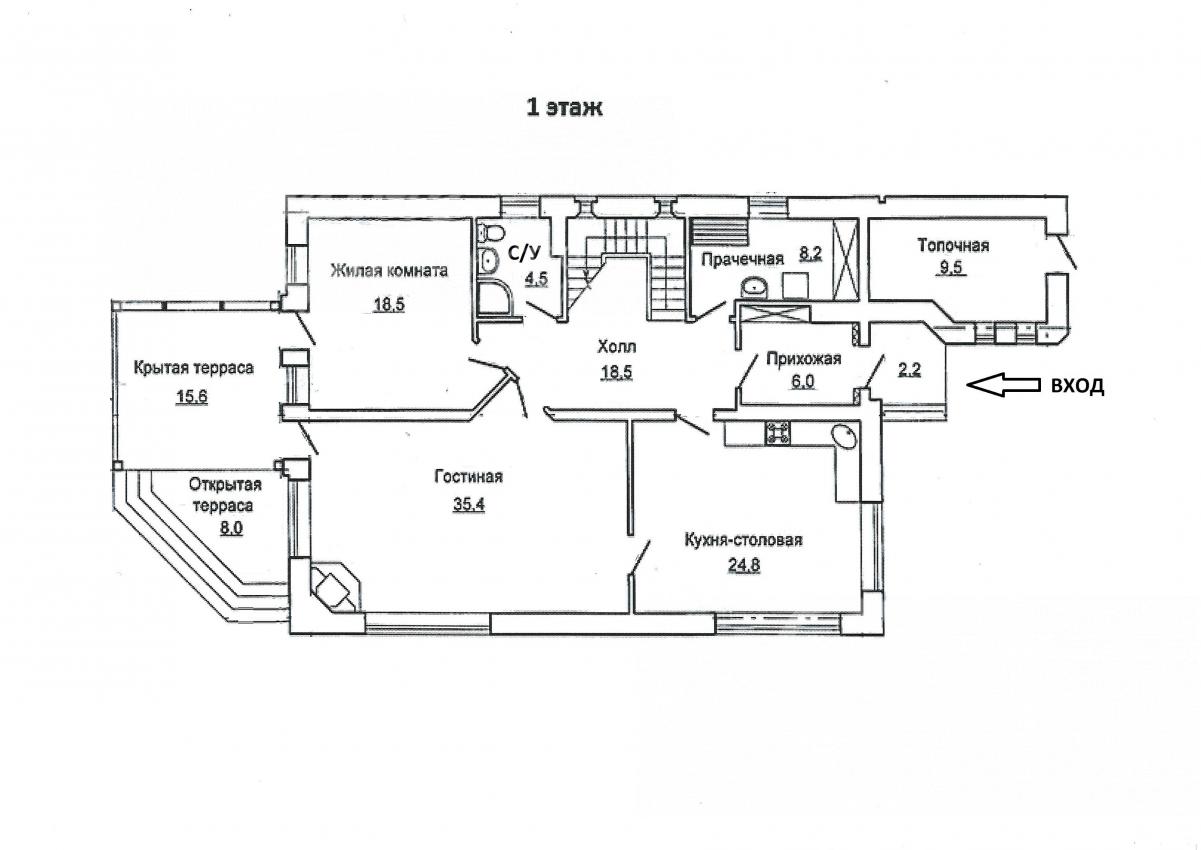 1-ый этаж: гараж на 2 а/м 34 кв.м (вход с улицы), котельная 10 кв.м; крыльцо 2 кв.м; прихожая 6 кв.м, постирочная 8 кв.м, спальня 19 кв.м, санузел 5 кв.м, кухня-столовая 25 кв.м, гостиная 35 кв.м с выходом на крытую террасу 15.6 кв.м;
