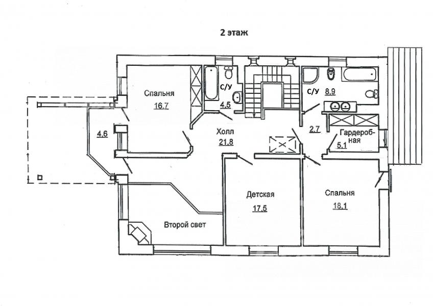 2-ой этаж: холл 22 кв.м, спальня хозяев 18 кв.м с гардеробной 5 кв.м и санузлом 9 кв.м, 2 спальни (18 и 17 кв.м с балконом 5 кв.м), санузел 4.5 кв.м;