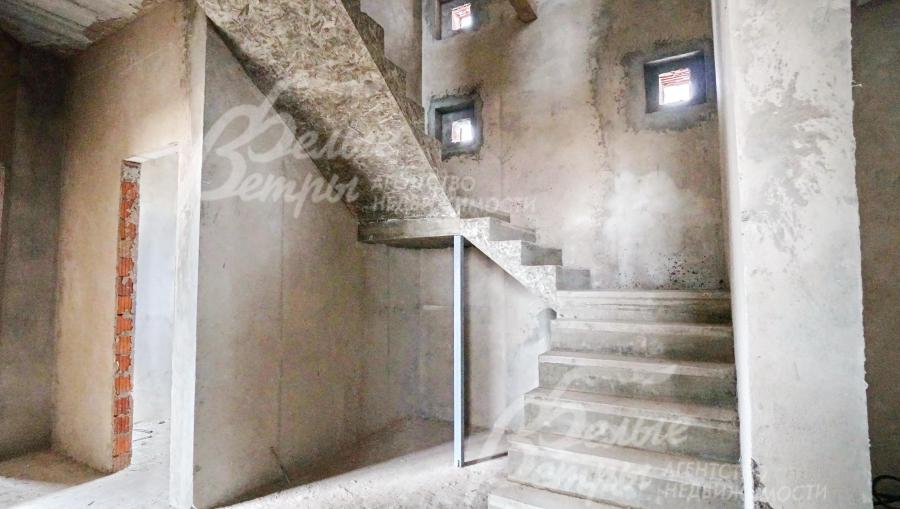 Описание внутренней отделки: стены оштукатурены, сделана черновая стяжка пола; лестничный марш ж/б монолитный; в дом заведены канализация (разведена по стоякам), вода, электричество. Отопление: сделаны отводы в котельной и закольцовано на одной батареи. Установлена входная металлическая дверь.