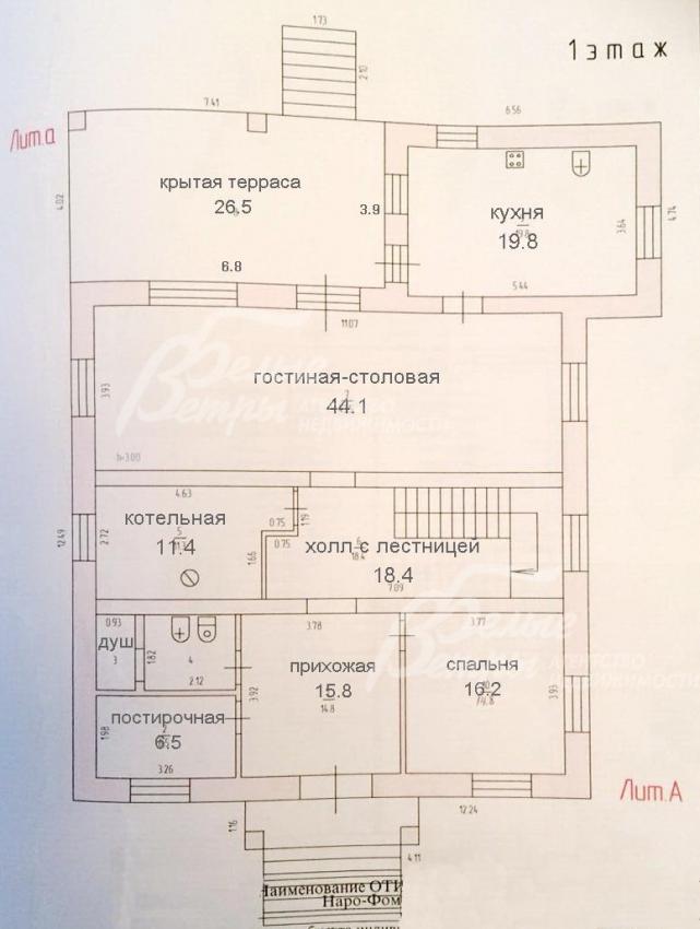 1-ый этаж: Прихожая 16 кв.м, спальная 16 кв.м, постирочная 6 кв.м, санузел 5 кв.м, холл 17 кв.м, котельная 11 кв.м, кладовая, столовая-гостиная 44 кв.м с выходом на террасу, кухня 20 кв.м с выходом на террасу