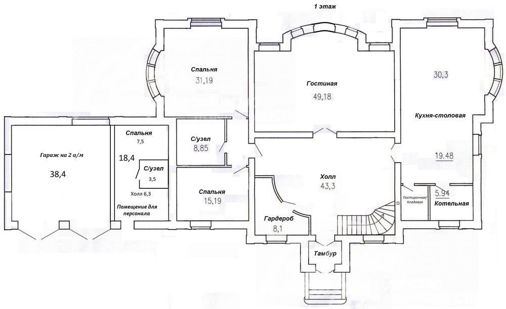 1-ый этаж: тамбур, холл 43 кв.м, гардеробная 8 кв.м, кухня-столовая 50 кв.м, гостиная 49 кв.м, гостевой санузел, котельная 6 кв.м, спальня 31 кв.м, санузел 9 кв.м, комната свободного назначения 15 кв.м, гараж на 2 авто 38 кв.м и квартира для персонала 20 кв.м;