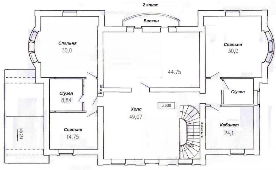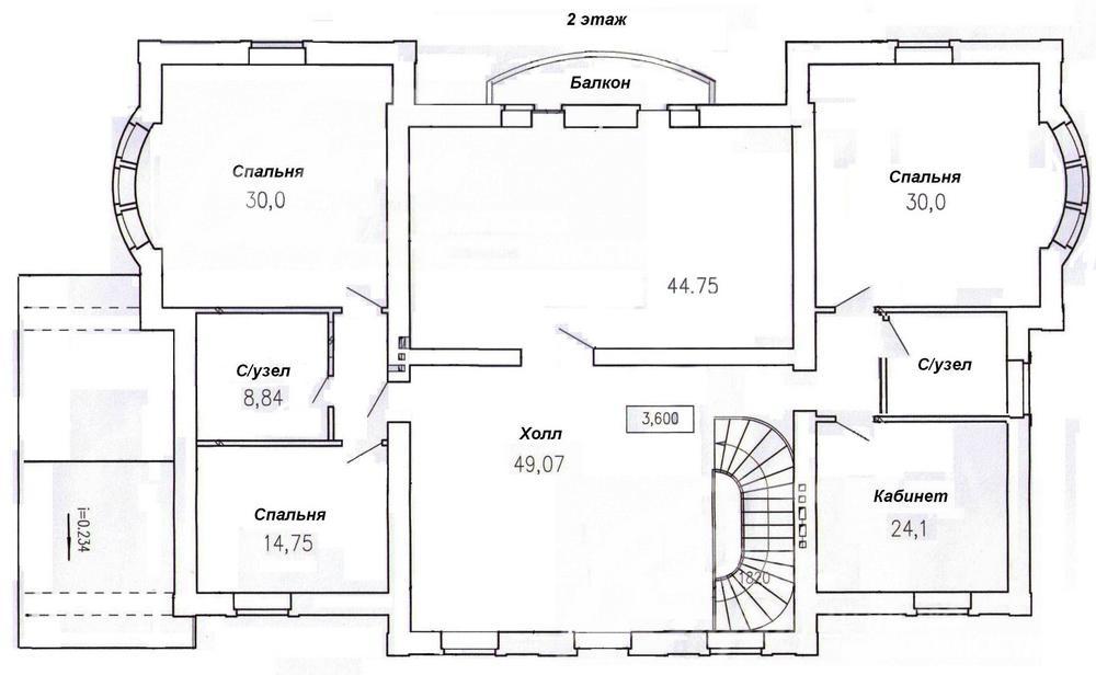 2-ой этаж: холл 49 кв.м, зона мастер-спальни 30 кв.м с санузлом 15 кв.м, и гардеробной 8 кв.м, спальня 30 кв.м, санузел 6 кв.м, кабинет 18 кв.м, просторное помещение 45 кв.м с балконом, где возможно организовать спальню с санузлом и гардеробной, кинотеатр, тренажерный зал, бильярд или 2-ую гостиную. Также площадь хола позволяет организовать дополнительный санузел или спальню с санузлом;