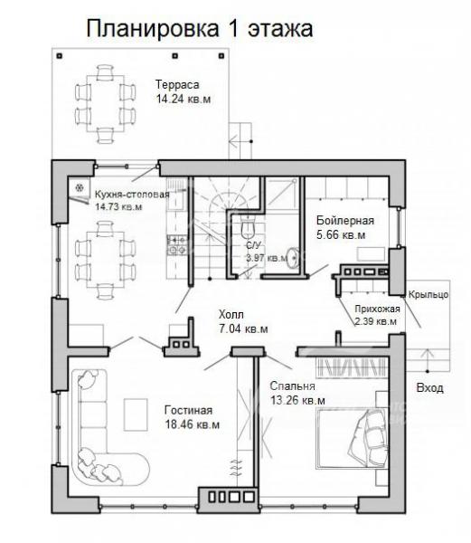 1-ый этаж: прихожая 2 кв.м, холл 7 кв.м, кухня-столовая 15 кв.м с выходом на террасу 14 кв.м, гостиная 19 кв.м, спальня 13 кв.м, с/у 4 кв.м, бойлерная 6 кв.м, холл 7 кв.м