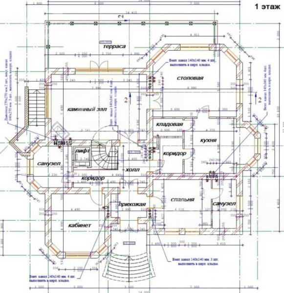 1-ый этаж: крыльцо, тамбур-прихожая, гостевая спальня со своим с/узлом, кабинет, общий с/узел, кухня, столовая, двухсветный каминный зал с выходом на террасу.