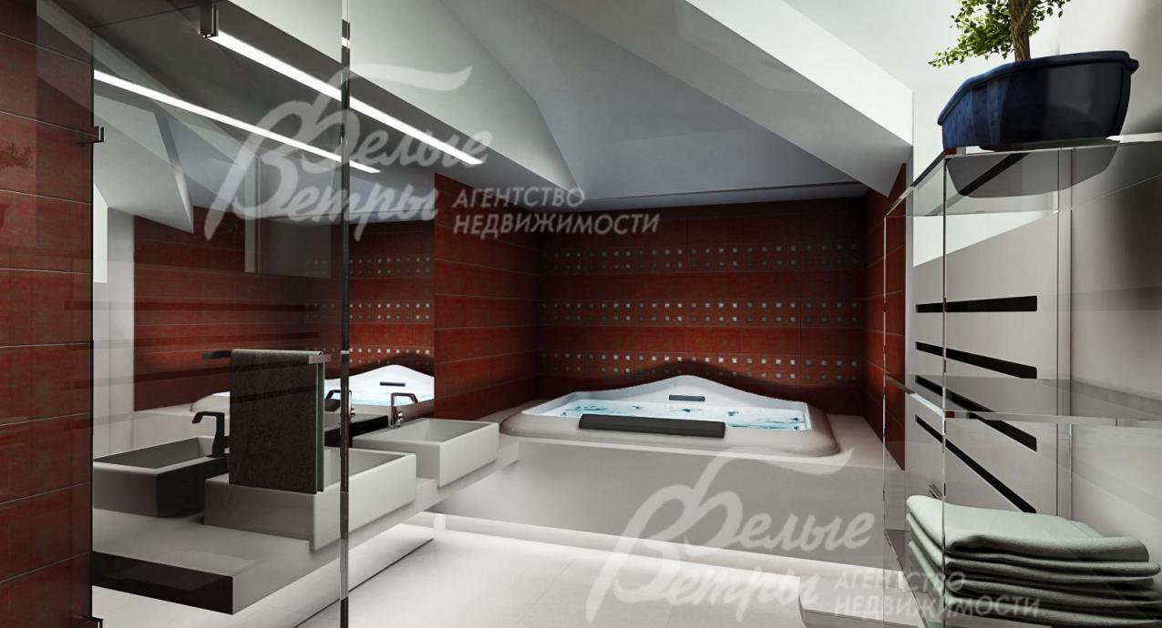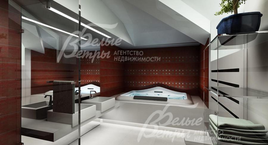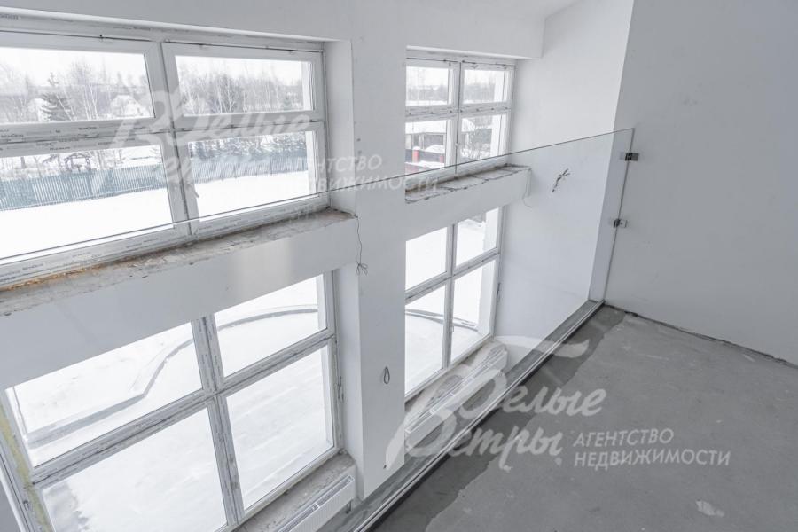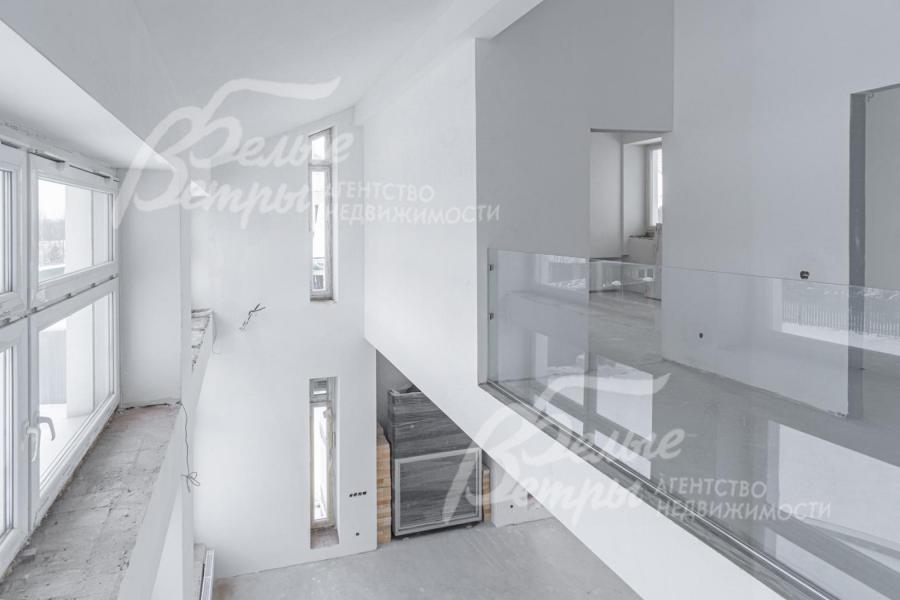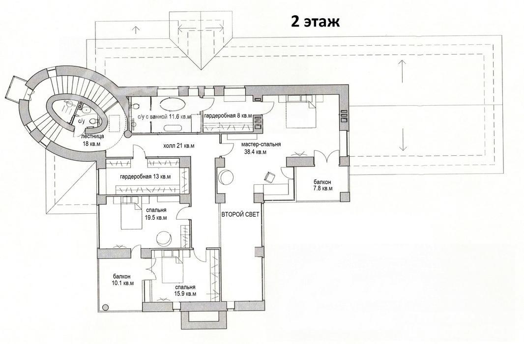 2-ой этаж: 150 кв.м: шикарная овальная лестница 18 кв.м, санузел, холл 21 кв.м, гардеробная 13 кв.м, две детские спальни 19.5 кв.м и 15.5 кв.м с выходами на балкон; шикарная мастер спальня 38.4 кв.м с выходом на балкон, с которого открывается вид на озеро и лес; гардеробная 8 кв.м, просторная ванная 11.6 кв.м с окнами и возможностью установки любой сантехники. В зоне второго света выполнены модные ограждения из каленого стекла по периметру.