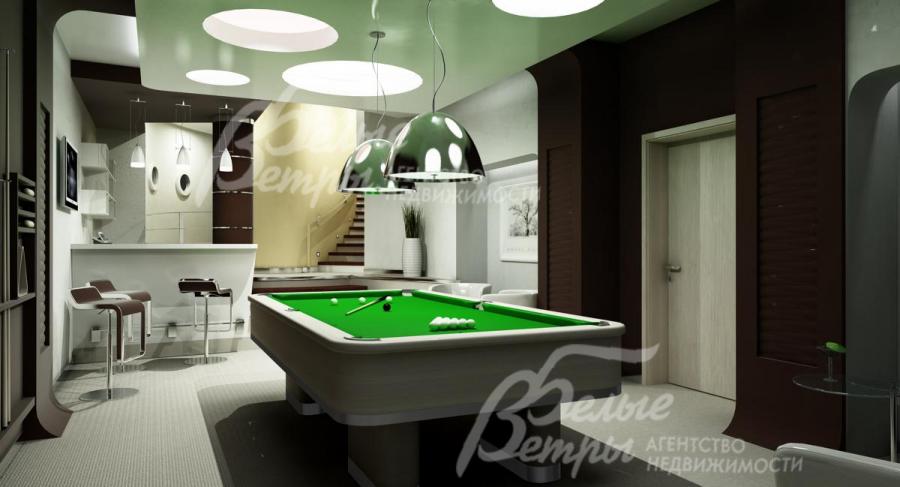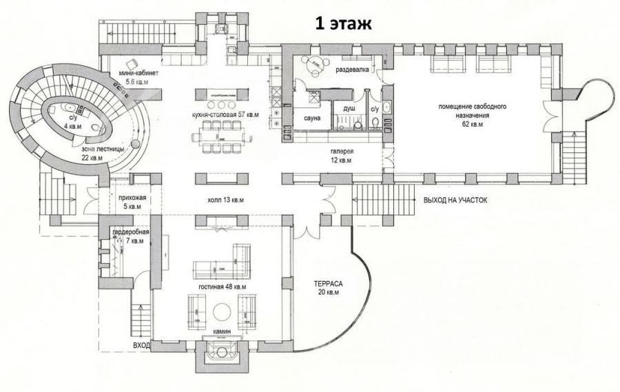 1-ый этаж: 261 кв.м: крыльцо - главный вход, прихожая 5 кв.м, гардеробная 7 кв.м с отдельным входом в коридор, гостевой санузел 4 кв.м, большая гостиная 48 кв.м с витражными окнами и уникальным немецким камином, с выходом на террасу и участок; жилая зона 62 кв.м, с отдельным входом - выходом во двор. Возможно оборудовать две спальни или спальню с гостиной. Далее примыкает блок сауны с раздевалкой, душевой и сан/узлом. Галерея 12 кв.м, кухня-столовая 57 кв.м с баром и островом, мини кабинет 5.6 кв.м, зона лестницы 22 кв.м