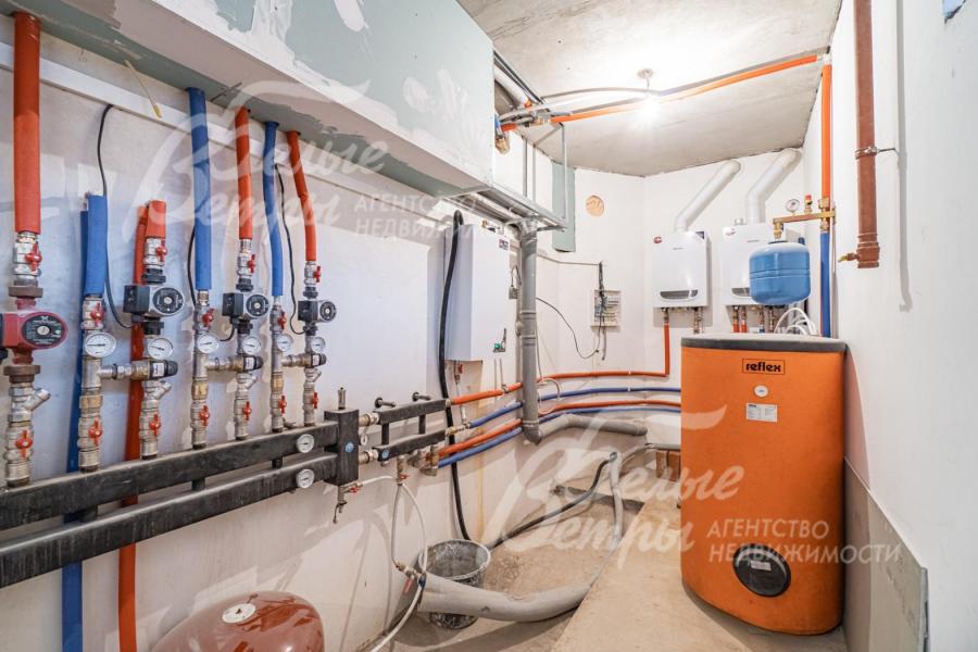 Инженерное обеспечение: полностью выполнена внутренняя разводка электрики, водопровода, канализации, приточно-вытяжной вентиляции, индивидуальный тепловой пункт. Установлены газовый котел и бойлер, дополнительно электрический котел. Есть дымоход для камина.