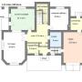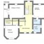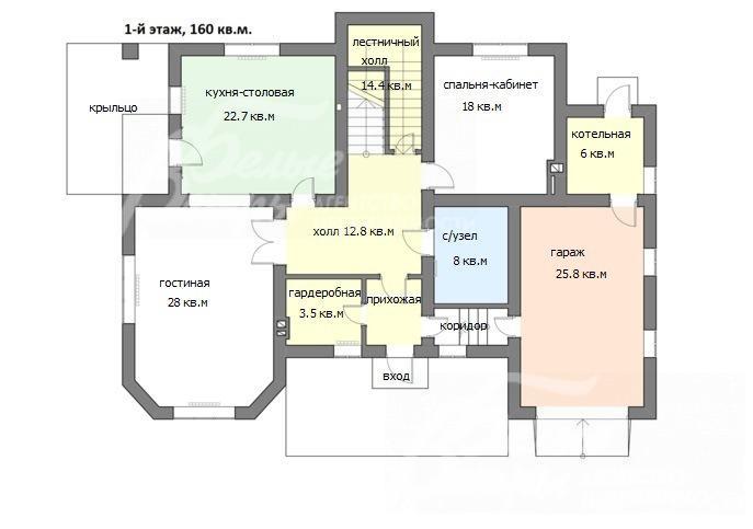1-ый этаж: Прихожая, гардеробная, коридор, гараж 26 кв.м, с/узел 8 кв.м, котельная 6 кв.м, спальня-кабинет 18 кв.м, холл 13 кв.м, гостиная 28 кв.м, кухня-столовая 23 кв.м, лестничный холл с кладовой 14.4 кв.м, крыльцо.