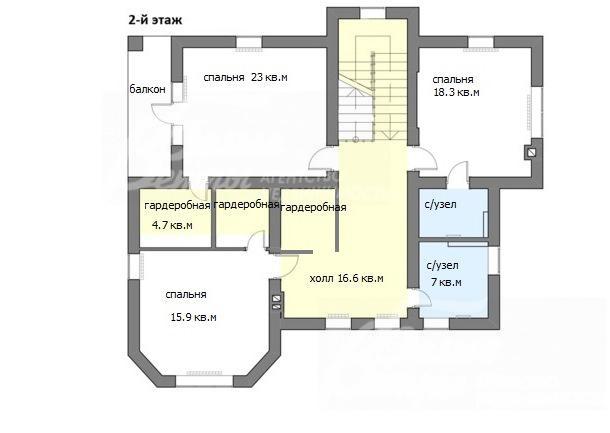 2-ой этаж: Лестничный холл 14.4 кв.м, холл 16.6 кв.м, с/узел 7 кв.м, гардеробная 4.7 кв.м, спальня 18 кв.м, спальня 23 кв.м, с/узел 4.6 кв.м, 2 гардеробных, спальня 16 кв.м, балкон.