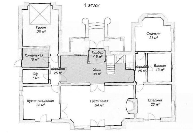 1-ый этаж: тамбур 4.5 кв.м, гостиная 54 кв.м, кухня-столовая 23 кв.м, холл со вторым светом 38 кв.м, спальня 21 кв.м, с/узел 13 кв.м, с/узел 7 кв.м, спальня 23 кв.м, котельная 10 кв.м, гараж 29 кв.м