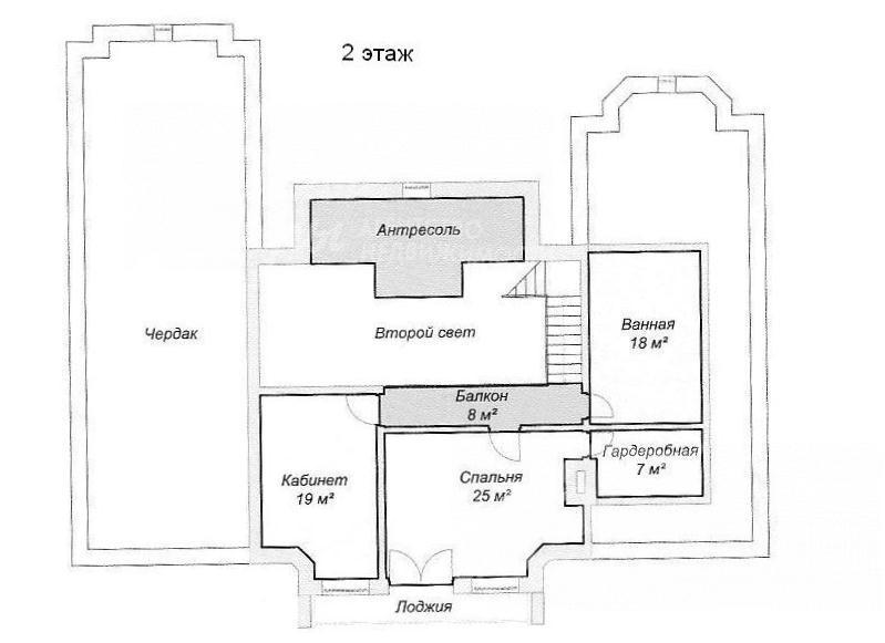 2-ой этаж: кабинет 19 кв.м, спальня 25 кв.м, с/узел 18 кв.м, гардеробная 7 кв.м, балкон 8 кв.м