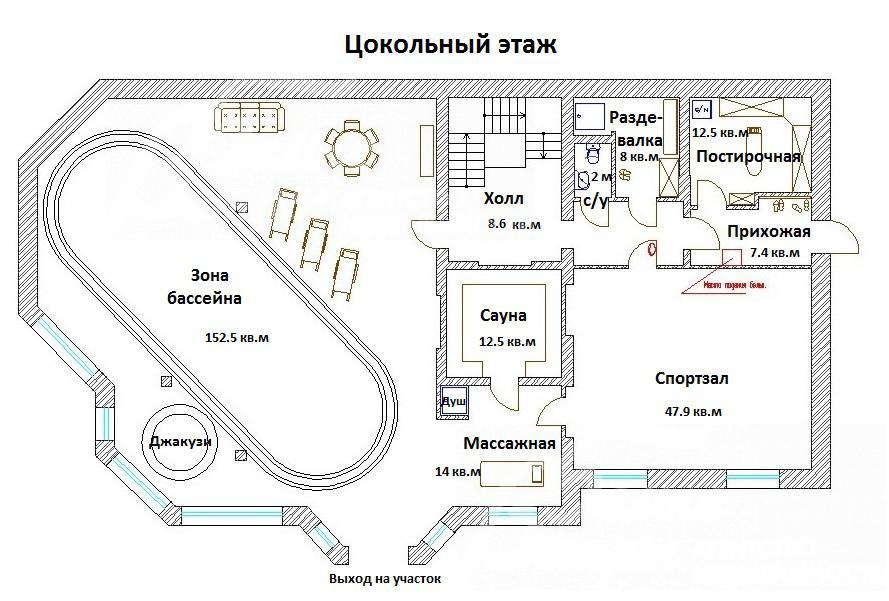 Цоколь: холл 9 кв.м, зона бассейна 152.5 кв.м с выходом на улицу (переливной с чашей 13.5х4.5 м, глубиной 1.8-2.5 м), а также чаша-джакузи диаметром 2 м), зона массажной с душевой 14 кв.м, сауна(хамам) 12.5 кв.м, спортзал 48 кв.м, раздевалка с душевой 8 кв.м, санузел, коридор-прихожая 7 кв.м с выходом на улицу, постирочная 12.5 кв.м