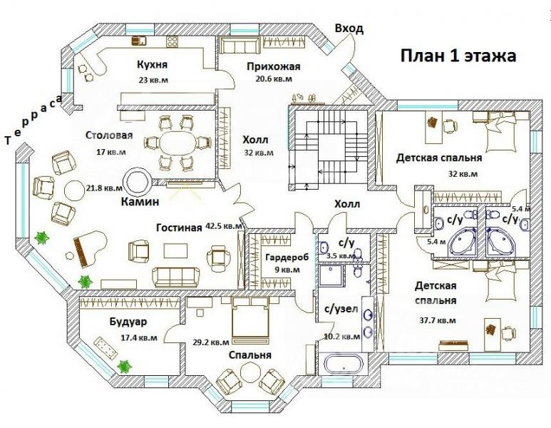 1-ый этаж: прихожая 21 кв.м, холл 32 кв.м, студия (зона гостиной 42.5 кв.м, зона каминной 22 кв.м, зона столовой 17 кв.м), кухня 23 кв.м, зона Главной спальни (тамбур-гардеробная 9 кв.м, спальня 29 кв.м, будуар 17 кв.м, санузел 10 кв.м), спальня 32 кв.м с санузлом 5 кв.м, спальня 38 кв.м с санузлом 5 кв.м, гостевой санузел 3.5 кв.м