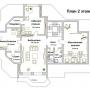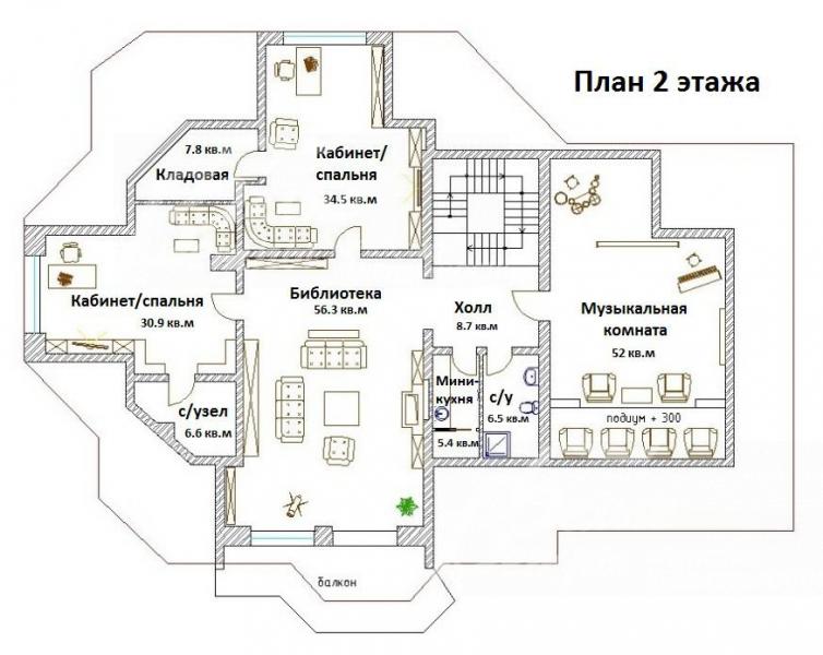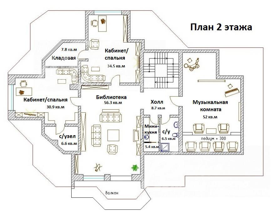 2-ой этаж: холл 9 кв.м, библиотека 56 кв.м с выходом на балкон, кабинет-спальня 31 кв.м с кладовой 7 кв.м, кабинет-спальня 34.5 кв.м с кладовой/санузлом 8 кв.м, кинозал 52 кв.м, мини-кухня 5 кв.м, санузел 6.5 кв.м