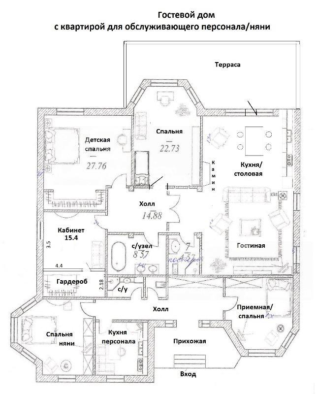 - Гостевой меблированный дом: прихожая-холл 14 кв.м, кухня-столовая/гостиная 62 кв.м с камином и выходом на открытую террасу 30 кв.м, спальня 23 кв.м, детская спальня 28 кв.м, общий санузел 8.5 кв.м, кабинет-спальня 15 кв.м, гардеробная 9.6 кв.м, спальня для няни 18 кв.м, кухня персонала 12 кв.м, приемная-спальня 16 кв.м, санузел (с душевой) 4 кв.м, санузел 2 кв.м;