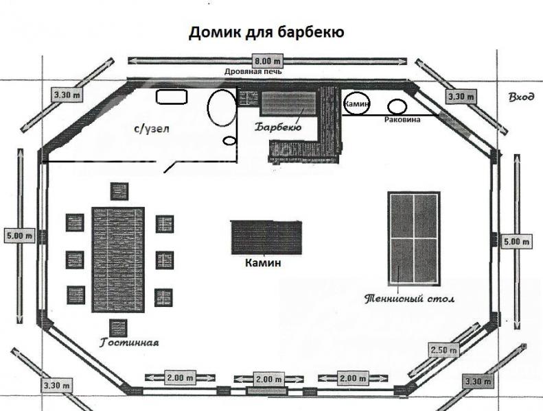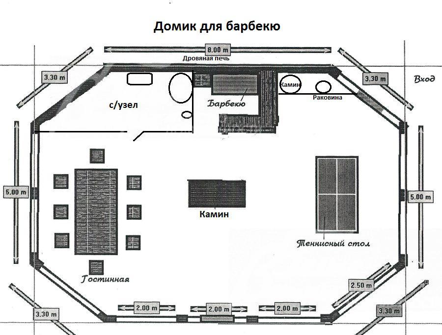 - Домик для барбекю 104.5 кв.м отапливаемый с панорамным остеклением: зал с камином, мангалом, печью, коптильней и с раковиной, санузел (с душевой);