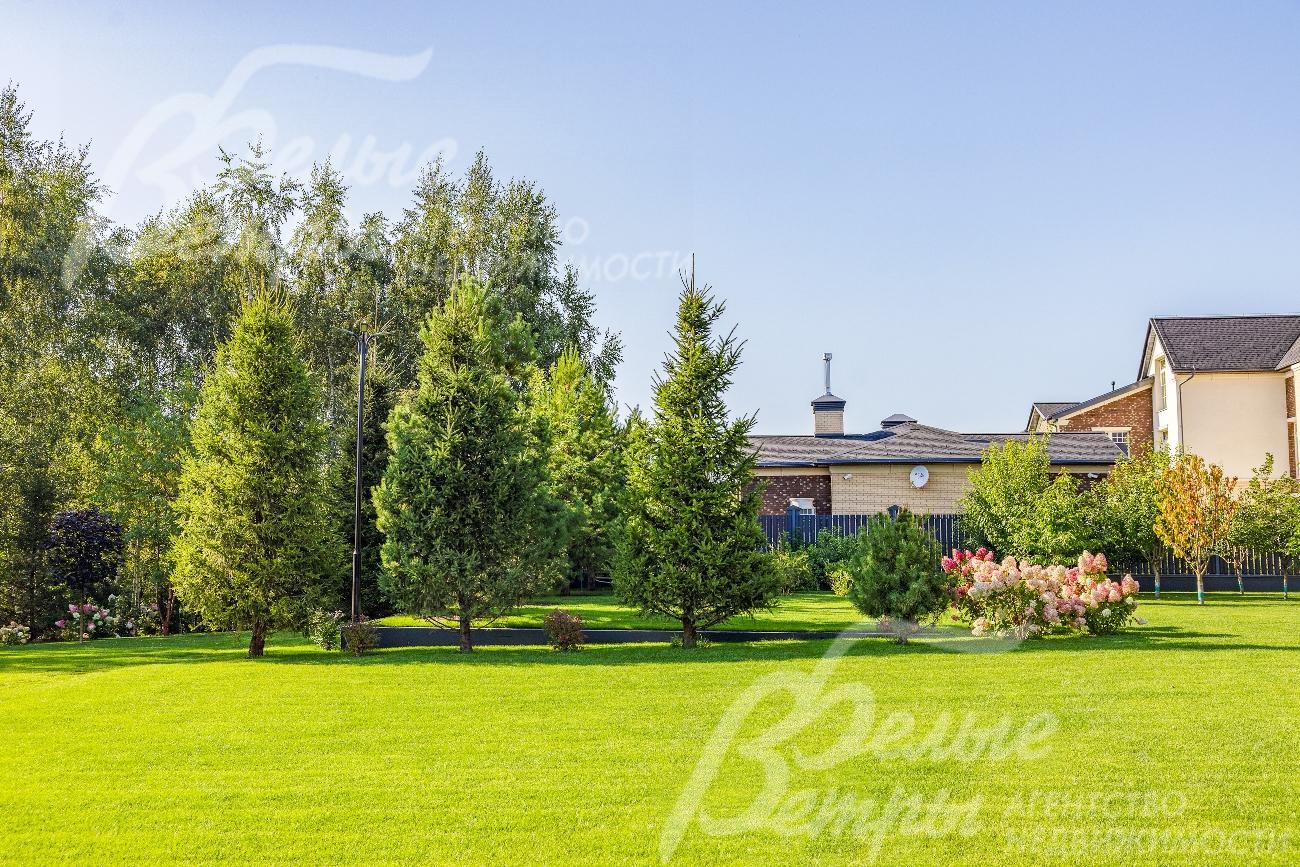 На участке ландшафтный дизайн, множество взрослых деревьев.